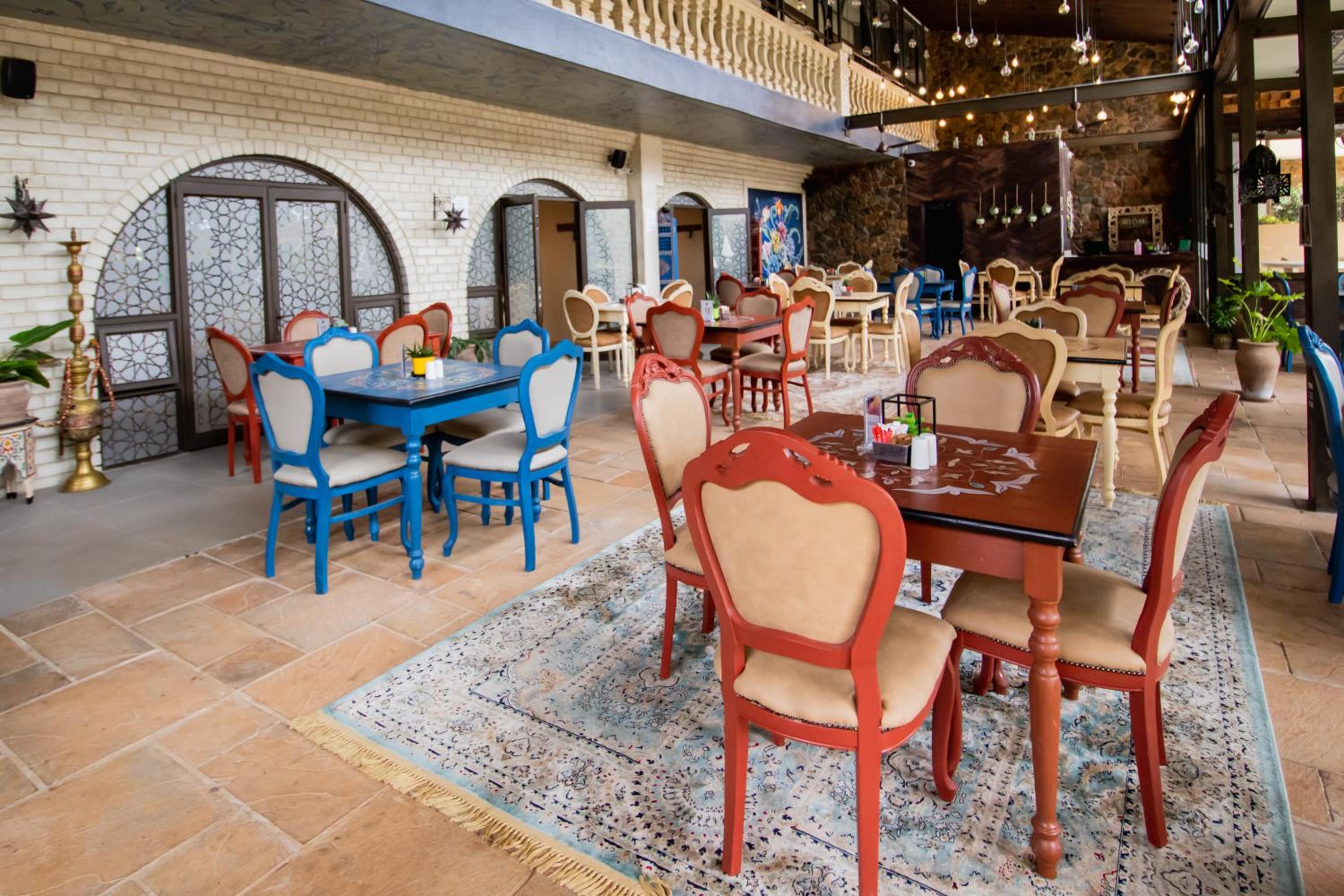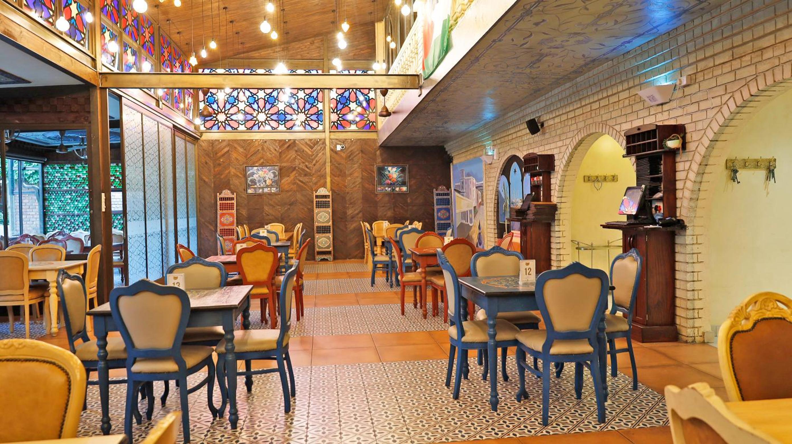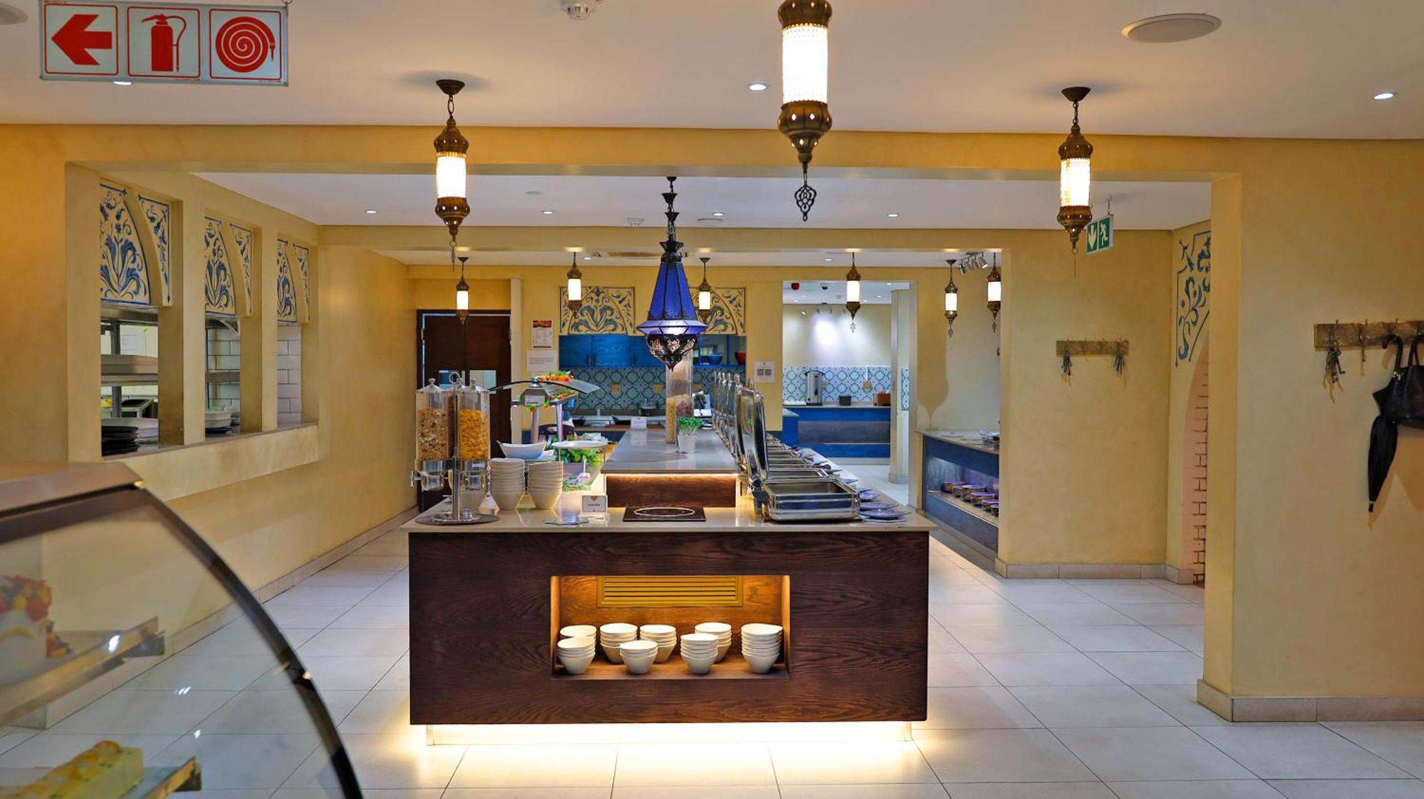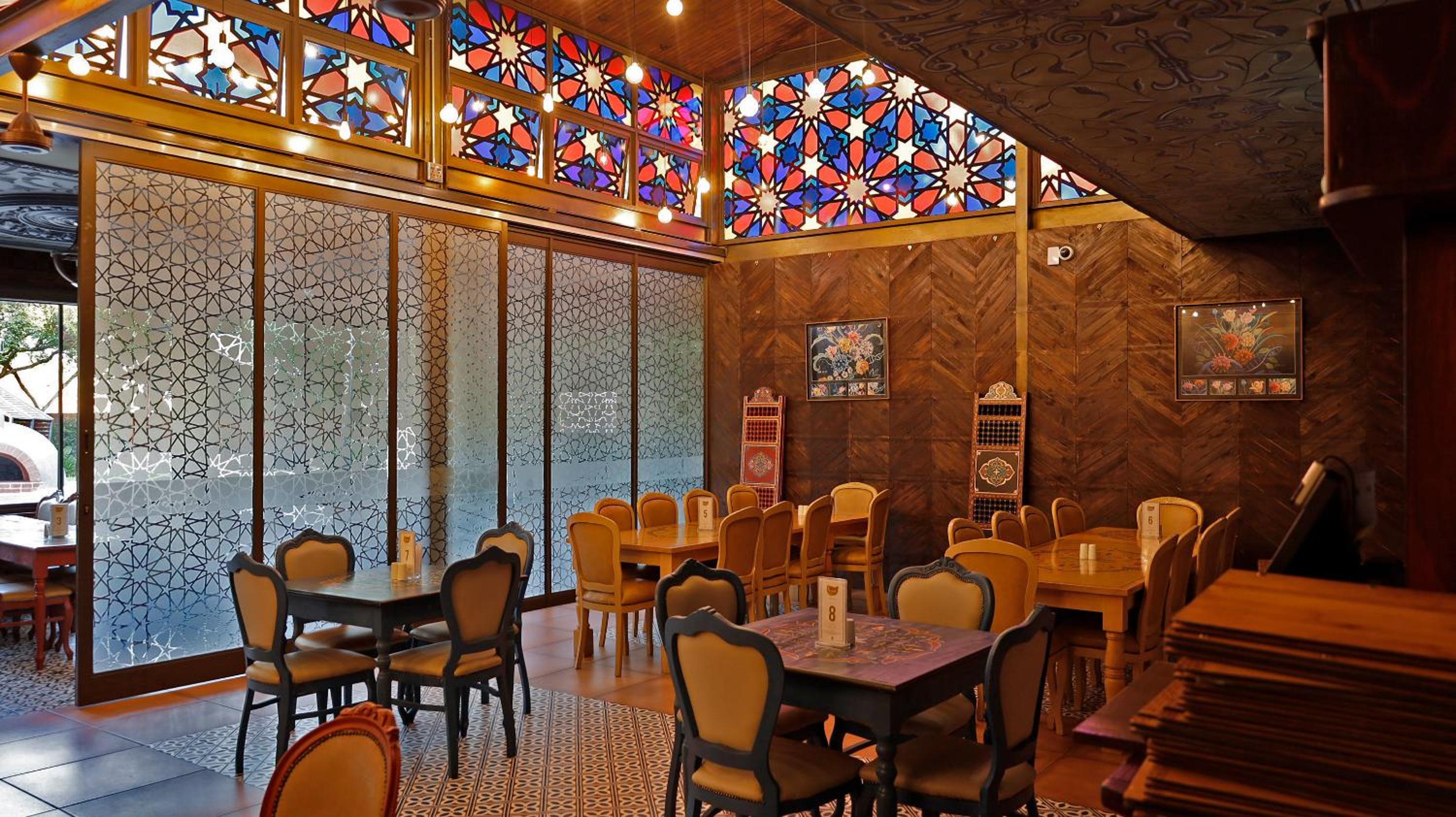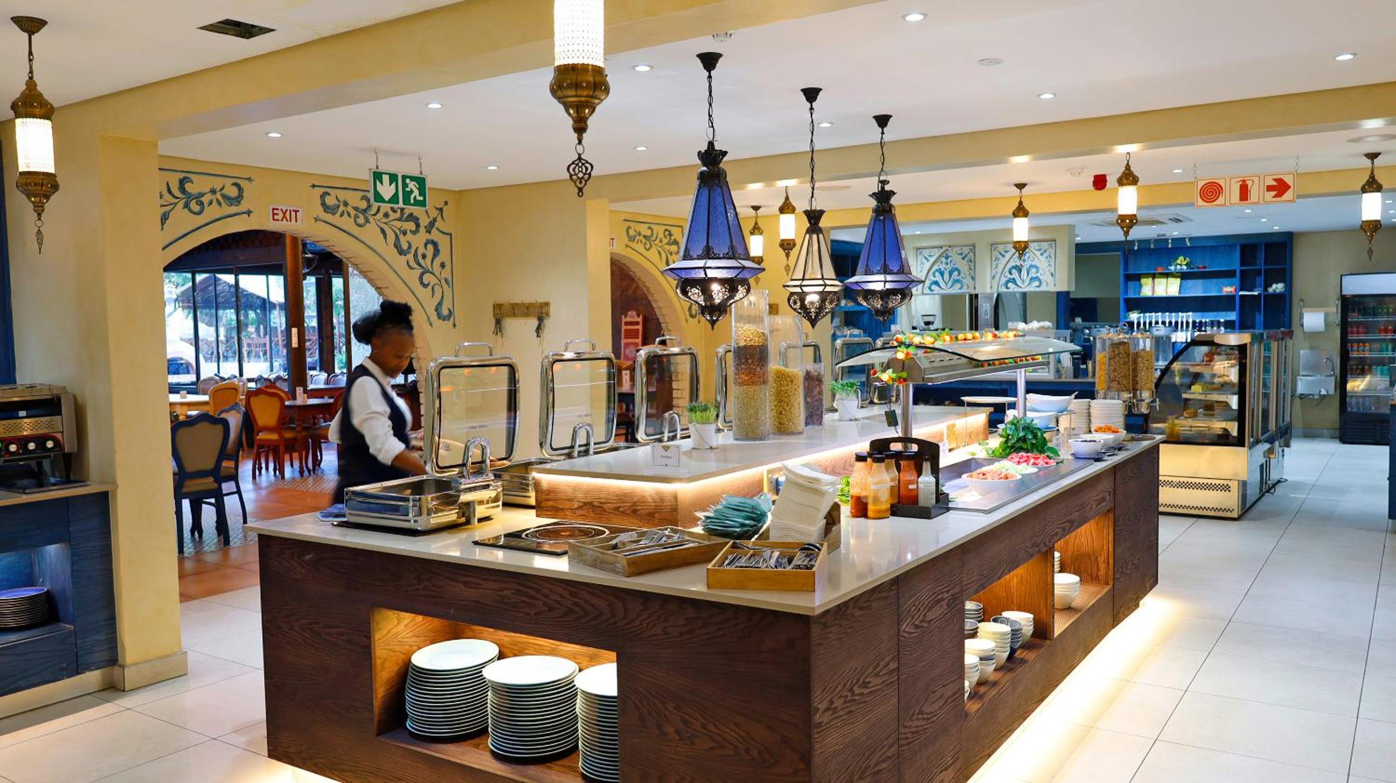 Guests can enjoy a variety of cuisine options, including Indian, Middle Eastern, and Moroccan dishes, with a halal option available upon request.
