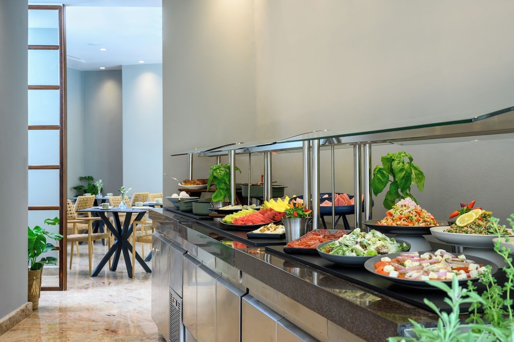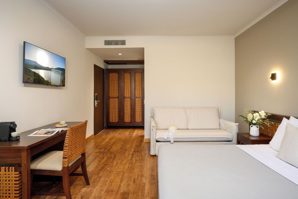 Good choice of food for breakfast and eggs made to order. Lady who served us very attentive.Lovely pool with very friendly lifeguard. Good air con and nice to have fridge and balcony. Local port and restaurants within easy walking distance. Beautiful bay and warm sea