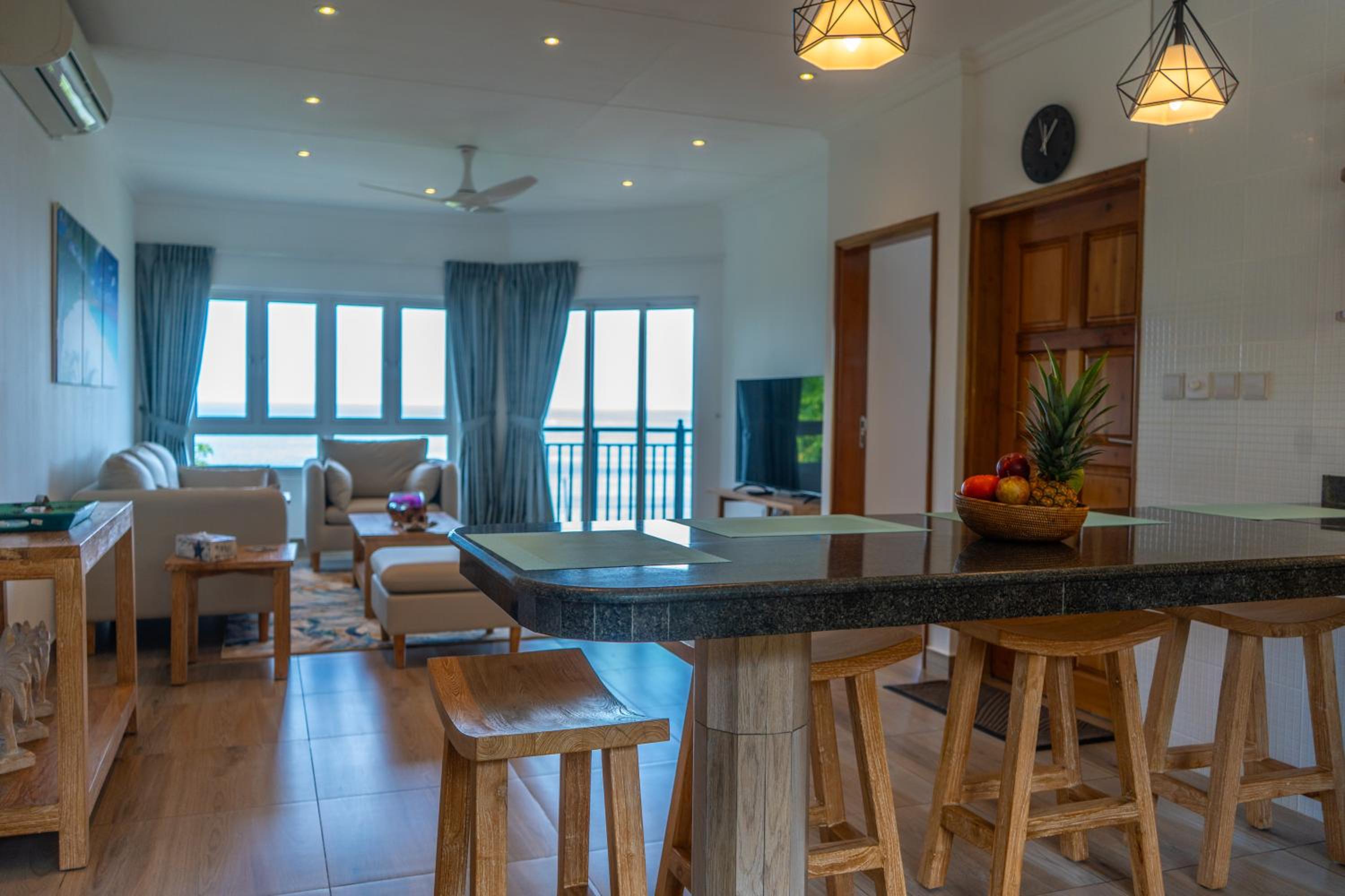 Located right at the beach at beau vallon. The owner and the care takers go above and beyond to make you feel welcome and comfortable. They were always available and checking in on us for support. The owner even helped us re-book our cancelled flights which would have been impossible without his help. 11/10 :)