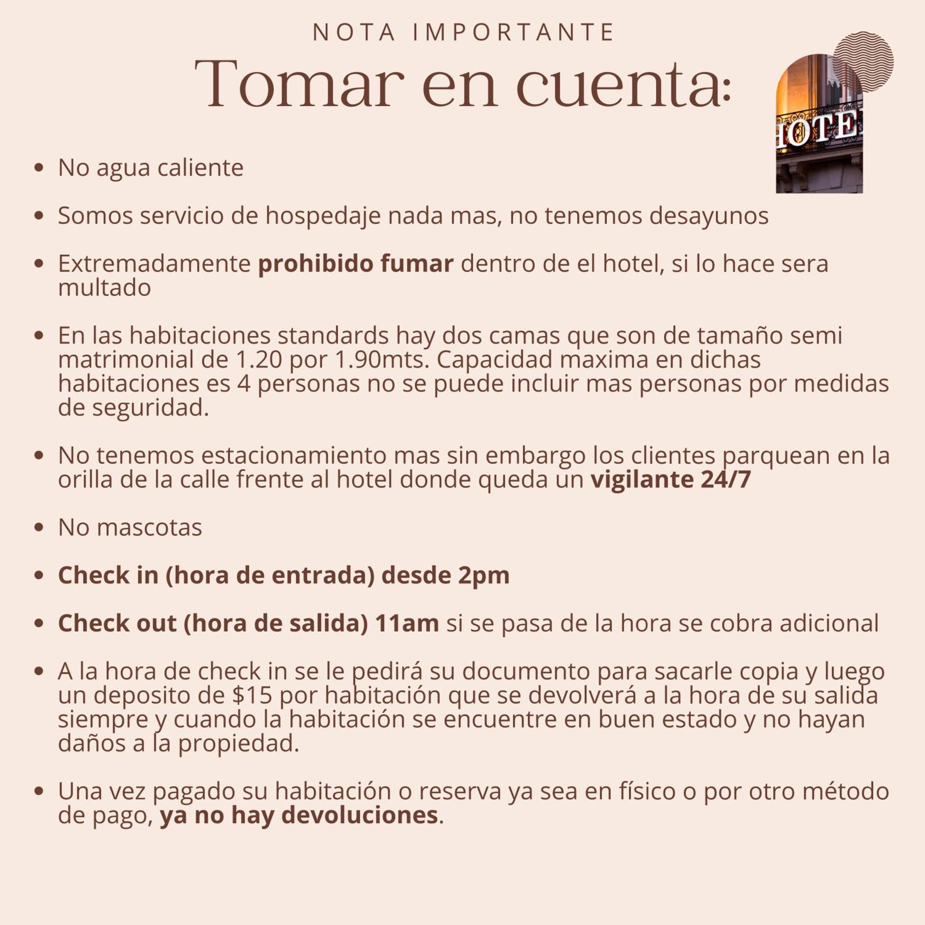 Me cayó MUY mal que se vanagloriaran de “en booking punto com decía que no hay agua caliente” cuando yo, aunque revisé bien, NO lo ví en el titulo de la habitación como mme enseñaron ellos en mi factura. El agua ni estaba tan fría, solo me cauó muy mal que decían, en efecto “pues es tu problema si no lees bien” agua caliente se puede esperar por el precio.