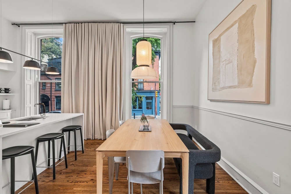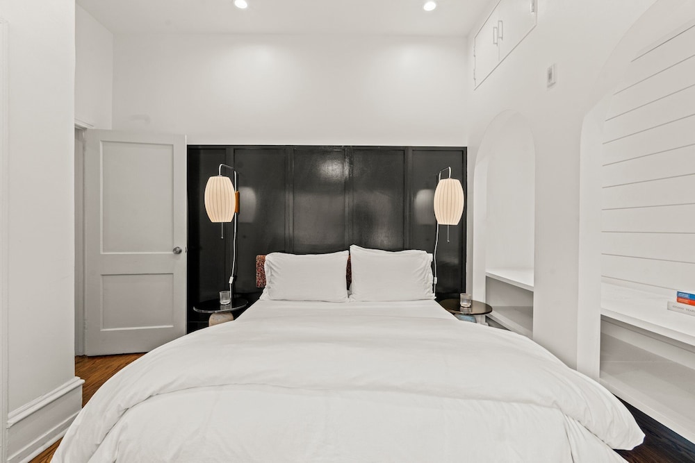Very special place. The first floor unit has 12 foot high ceilings and is decorated and furnished with style. Very airy and great natural light. Windows could use a wash but they offered great soundproofing. The vibe is 10/10 here. 2 bedroom downstairs were a bit noisy on a Sunday night, but much quieter on Monday night. Bring ear plugs and a sound machine for the kids just in case. Excellent location. Budget $45 per day for parking. The host is very responsive and attentive. Grocery store across the street is open late too. Would love to stay here again.