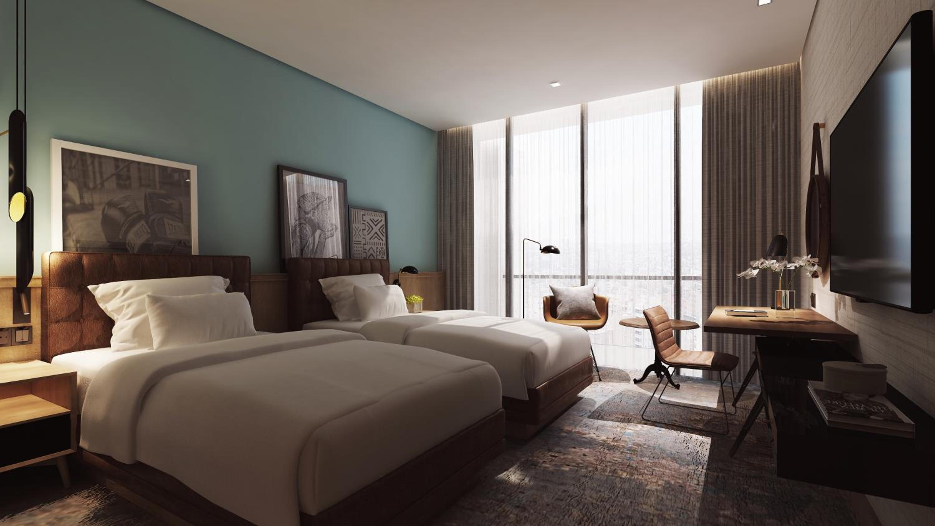 Le décor de l’hôtel avec une ambiance accueillante , la modernité des chambres alliant technologie, confort et esthétique.
