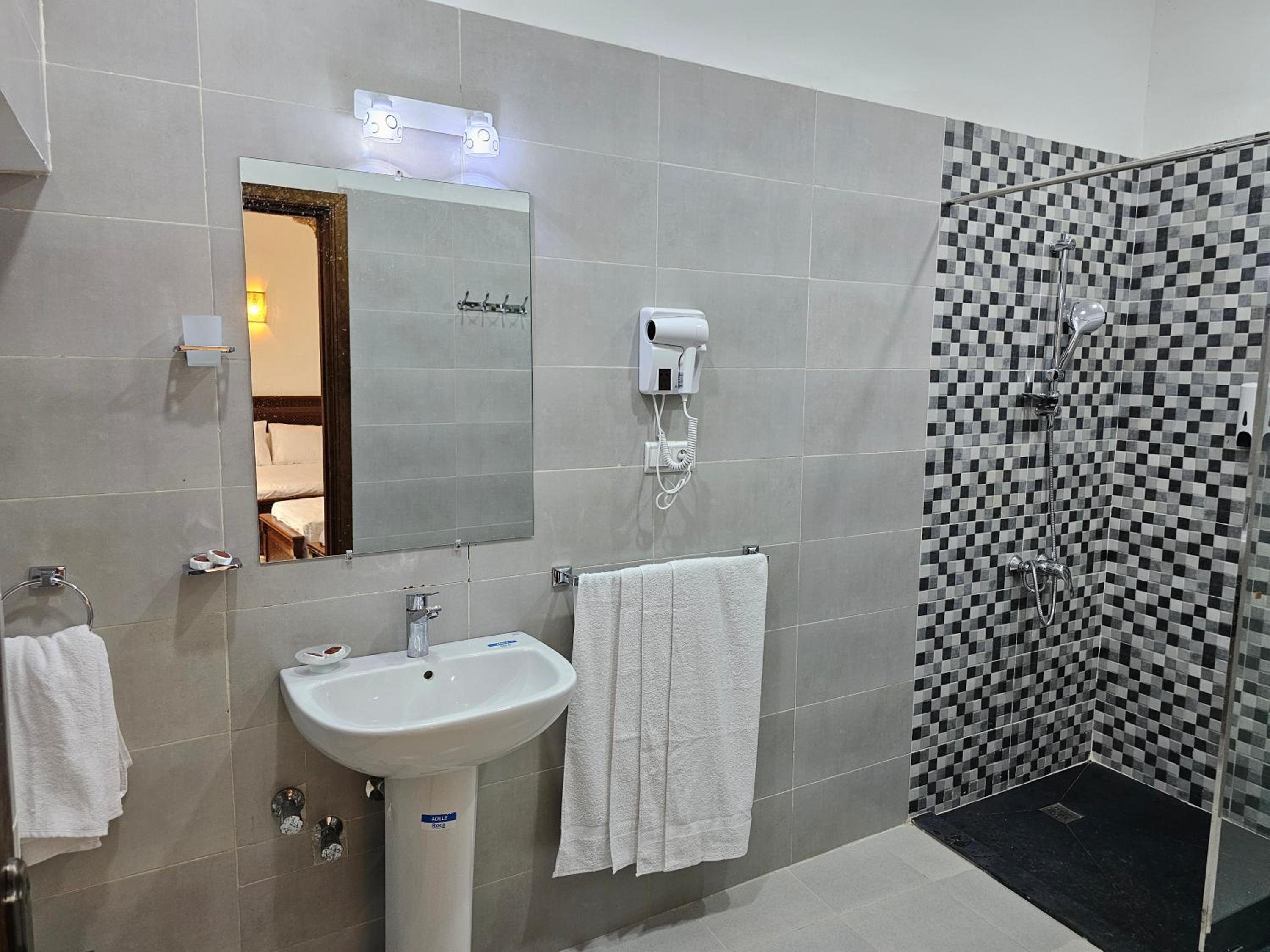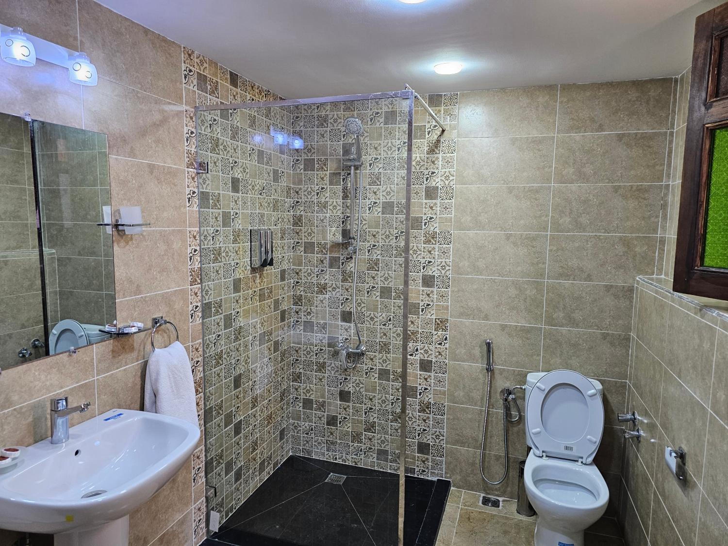 Experience comfort and style in our air-conditioned rooms with modern amenities. Each room is equipped with a flat-screen TV, safety deposit box, and private bathroom for your convenience.