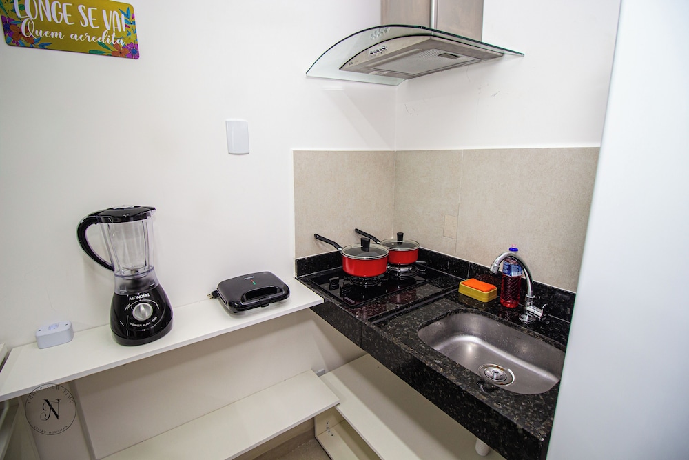 Na cozinha, um microondas, geladeira com congelador, um cooktop de duas bocas e algumas panelas (duas caçarolas é uma frigideira). Também possui três pratos e talheres. Essa cozinha tem um espaço americano. Mas que por ser fechado em baixo fica bem desconfortável para as pernas.