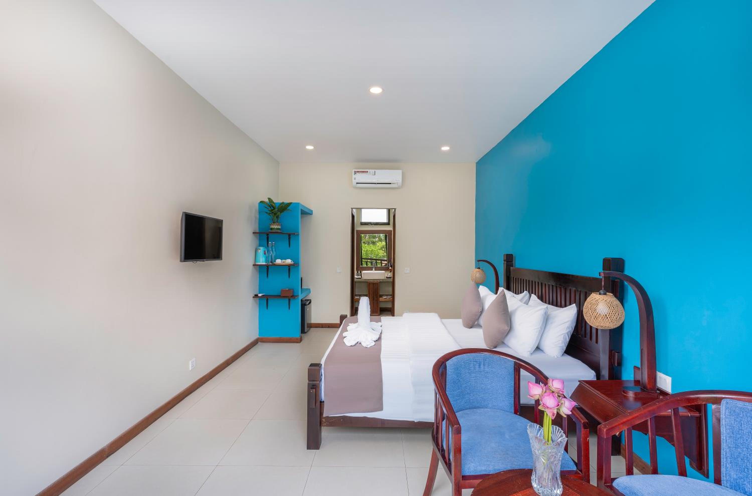 Air pollution from locals burning rubbish. Bedding and toilet smelled moldy. Full of mosquitoes due to surrounding empty lots. As a result the sliding doors had to be kept shut at all times, as there is no screen door. Also the room had no outside windows. Inconvenient location at least 10 mins tuktuk ride or 20 mins walk to any decent cafes or place of interest. No breakfast or any food available.