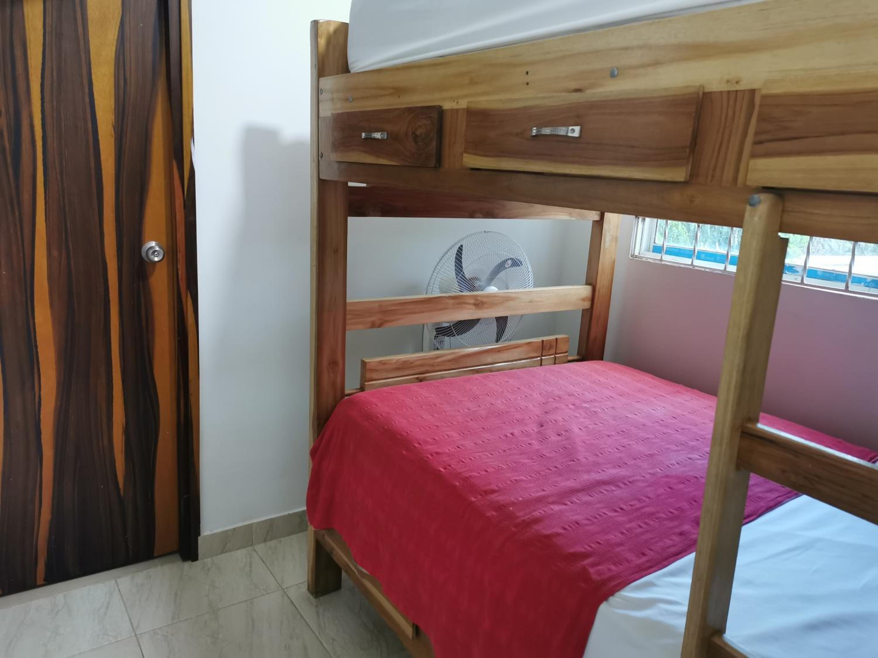 Esta cerca a la calle principal, cerca a la playa y a la zona de restaurantes ( muy buenos), tenia buen tamaño la habitación, aire y abanico
