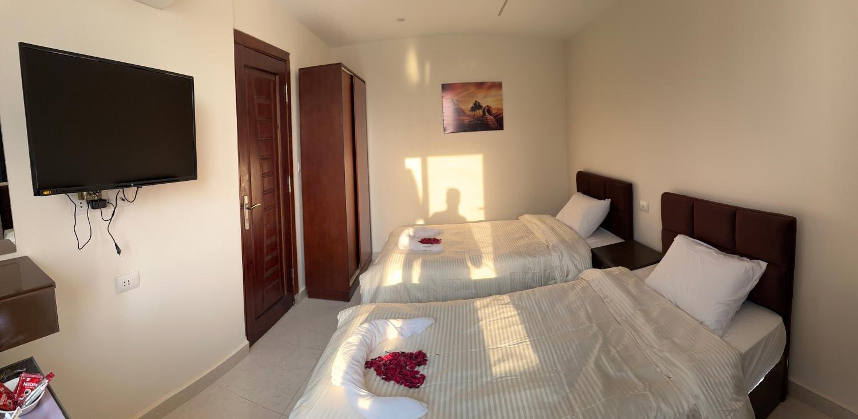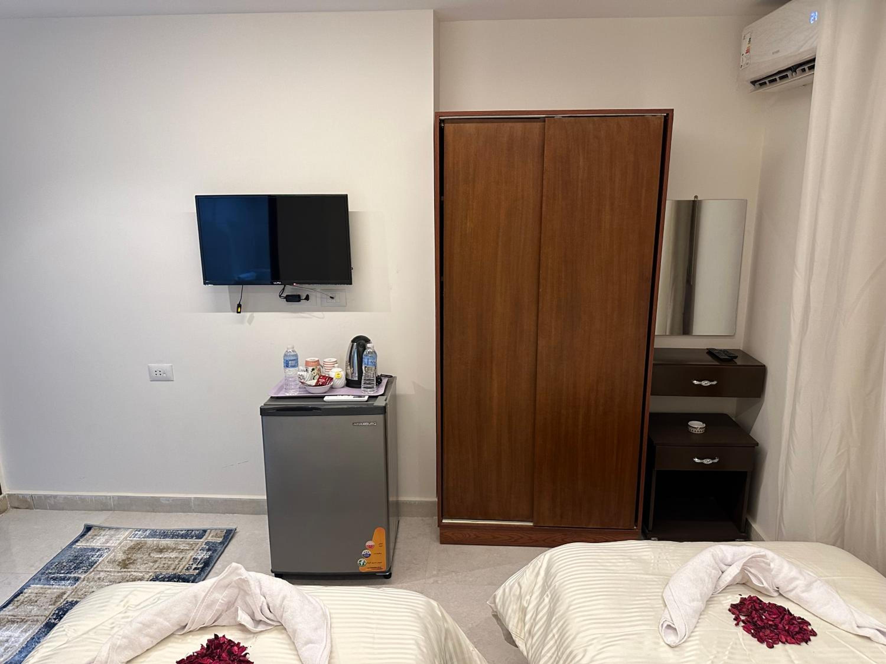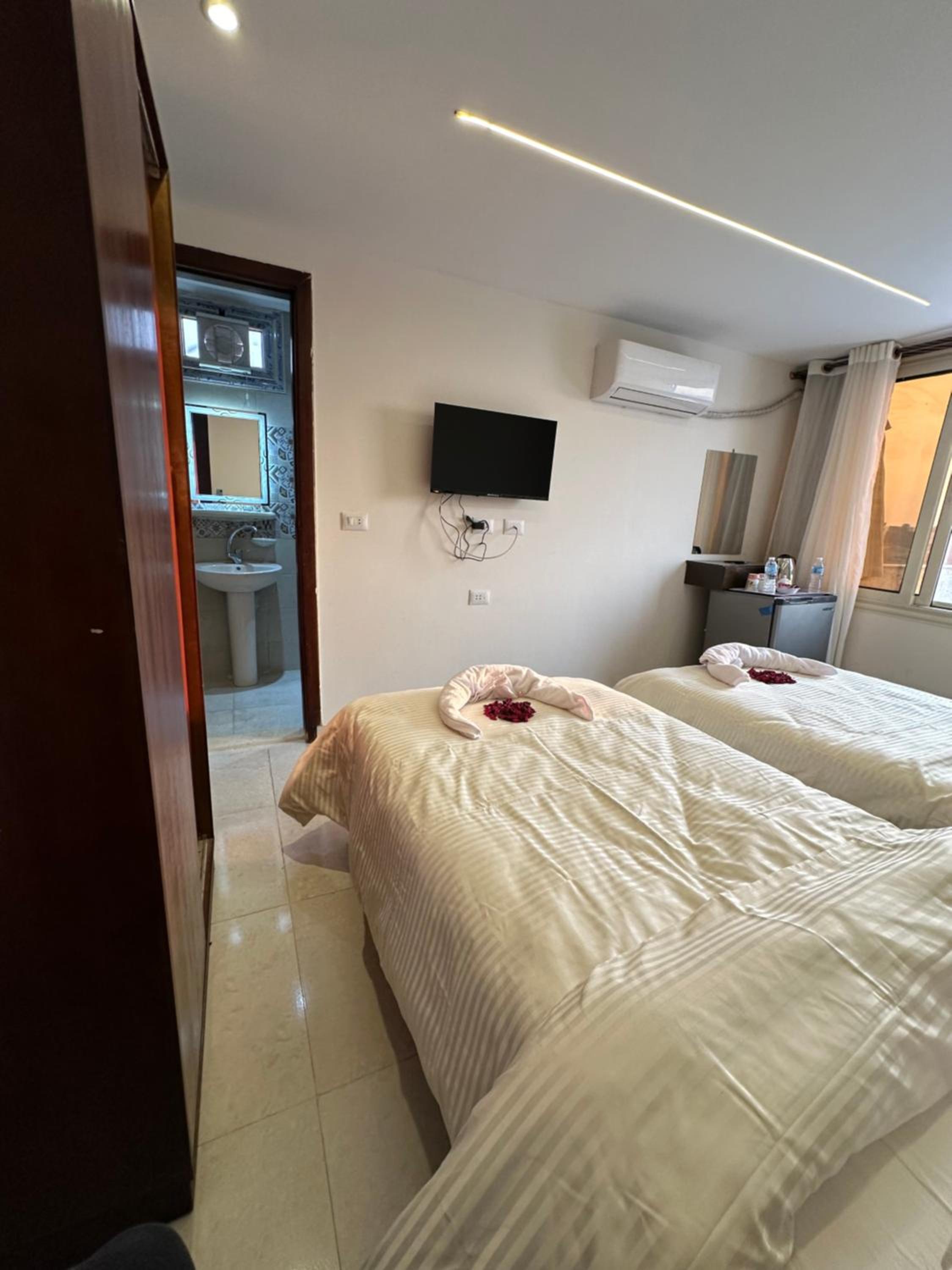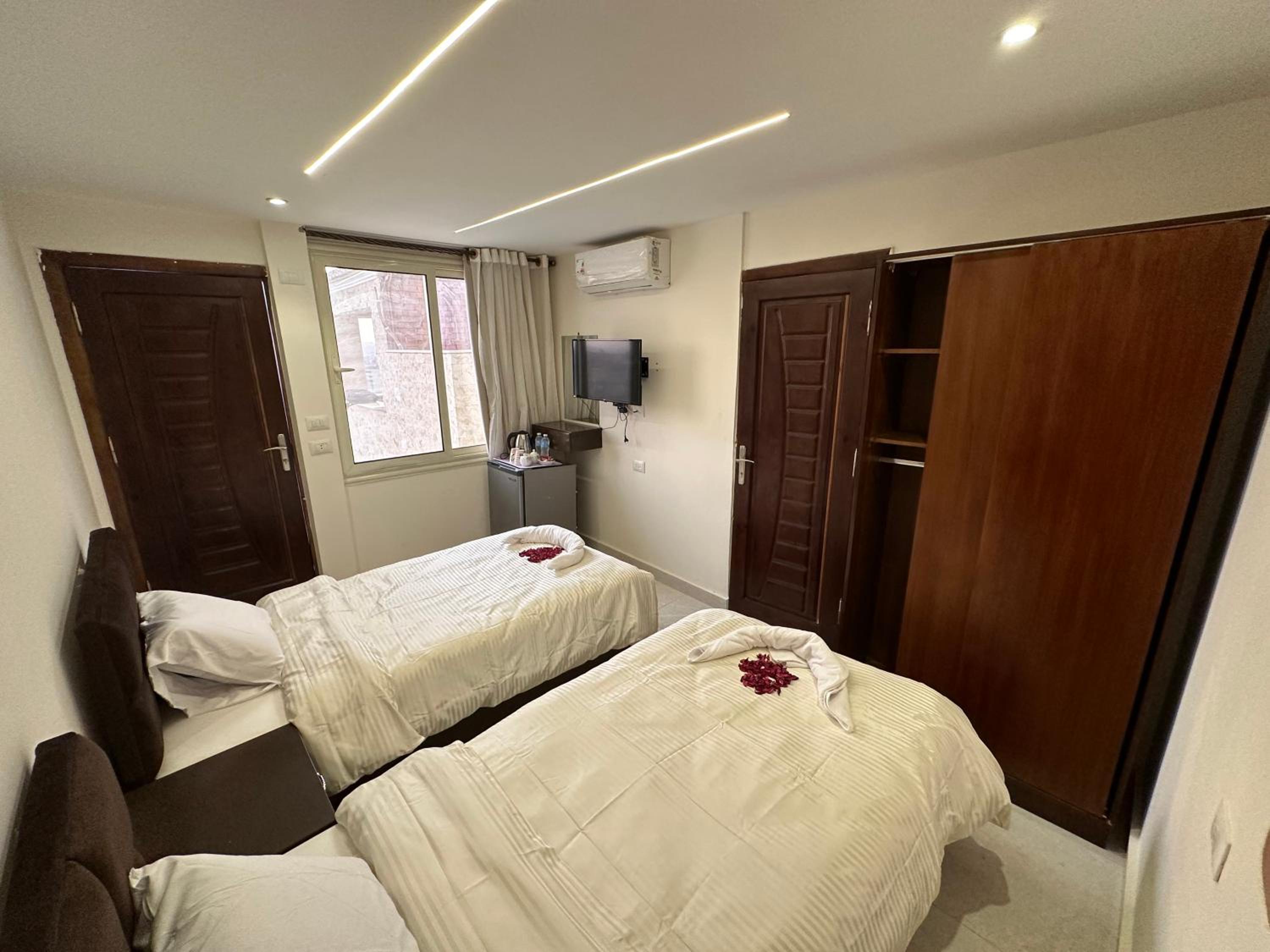 Luxurious Accommodation - Sun 3 Pyramids Inn offers air-conditioned rooms with modern amenities like a coffee machine, microwave, and flat-screen TV. Guests can also enjoy city views from selected rooms, along with a private terrace and balcony.