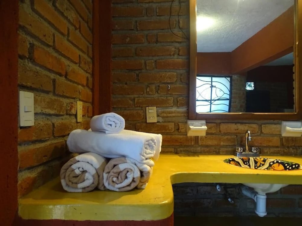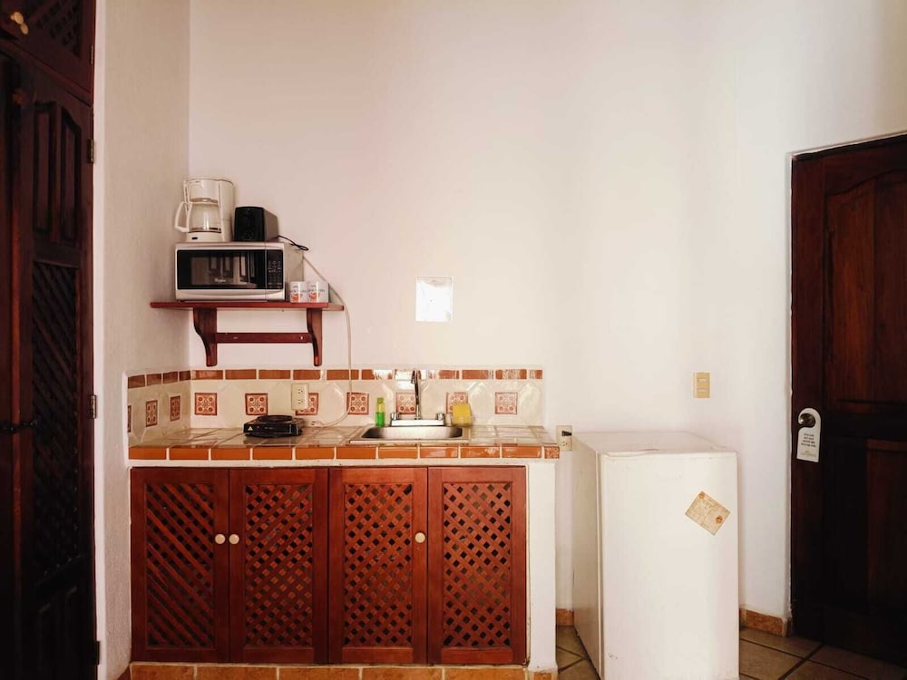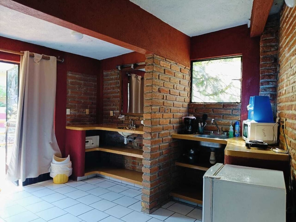Fuera de eso… cuentan con una alberca muy bonita, las habitaciones cuentan con cocina y platos (que te recomiendo que laves porque no estaban bien limpios). Y si planeas llegar muy temprano o muy tarde te recomiendo que te comuniques al hotel antes de tu llegada.