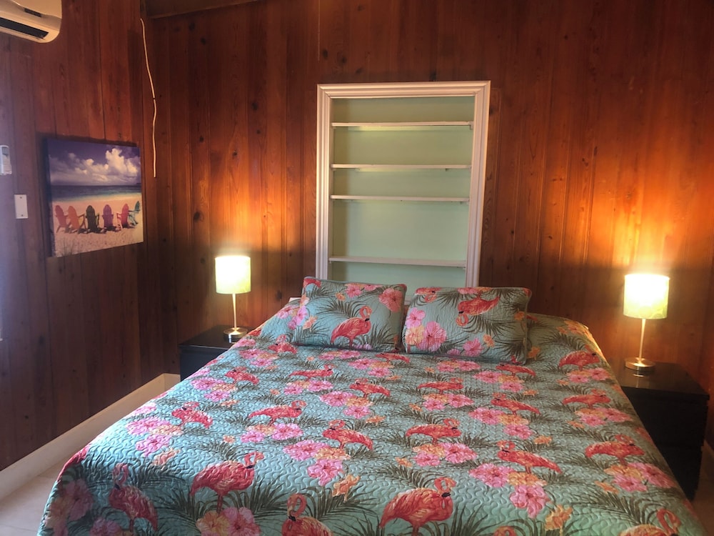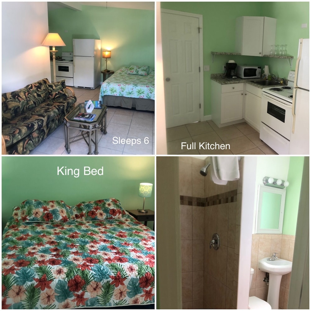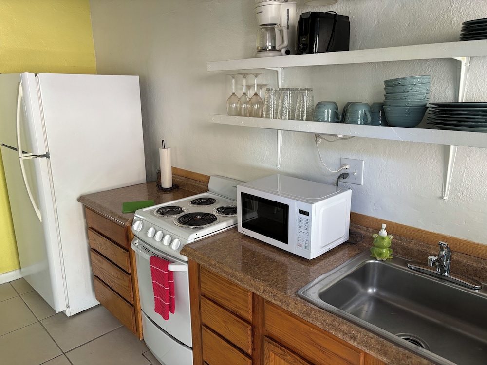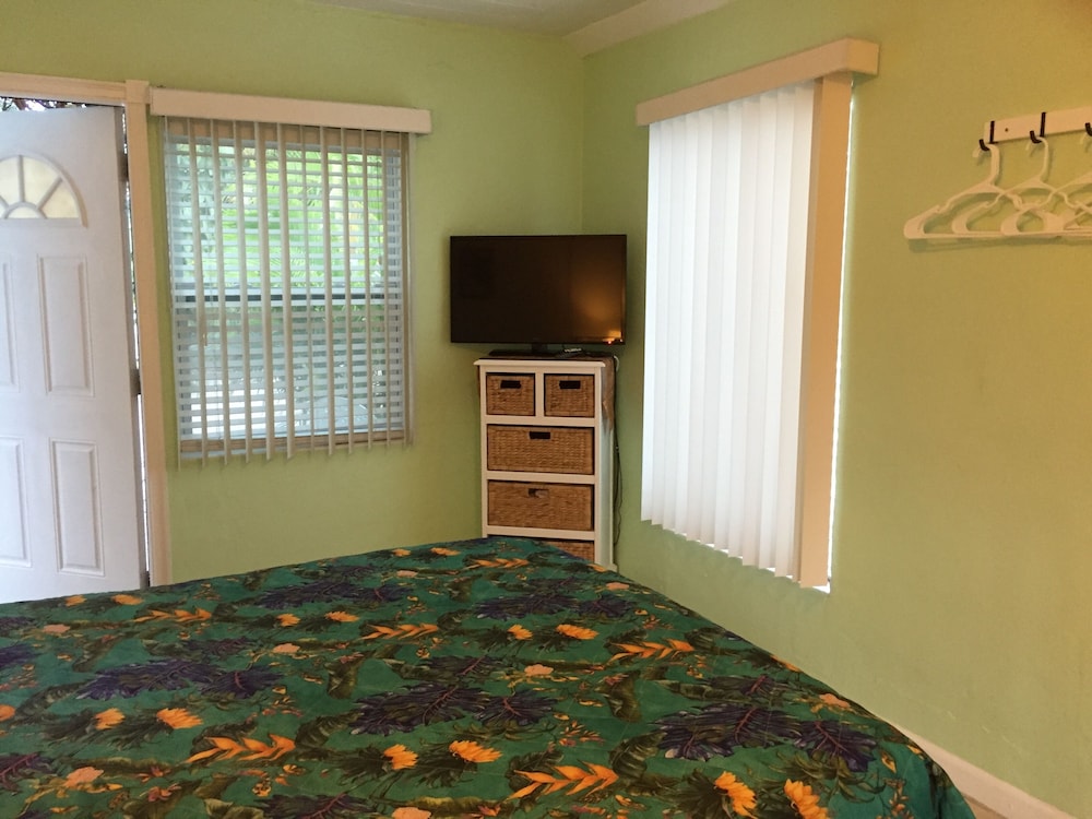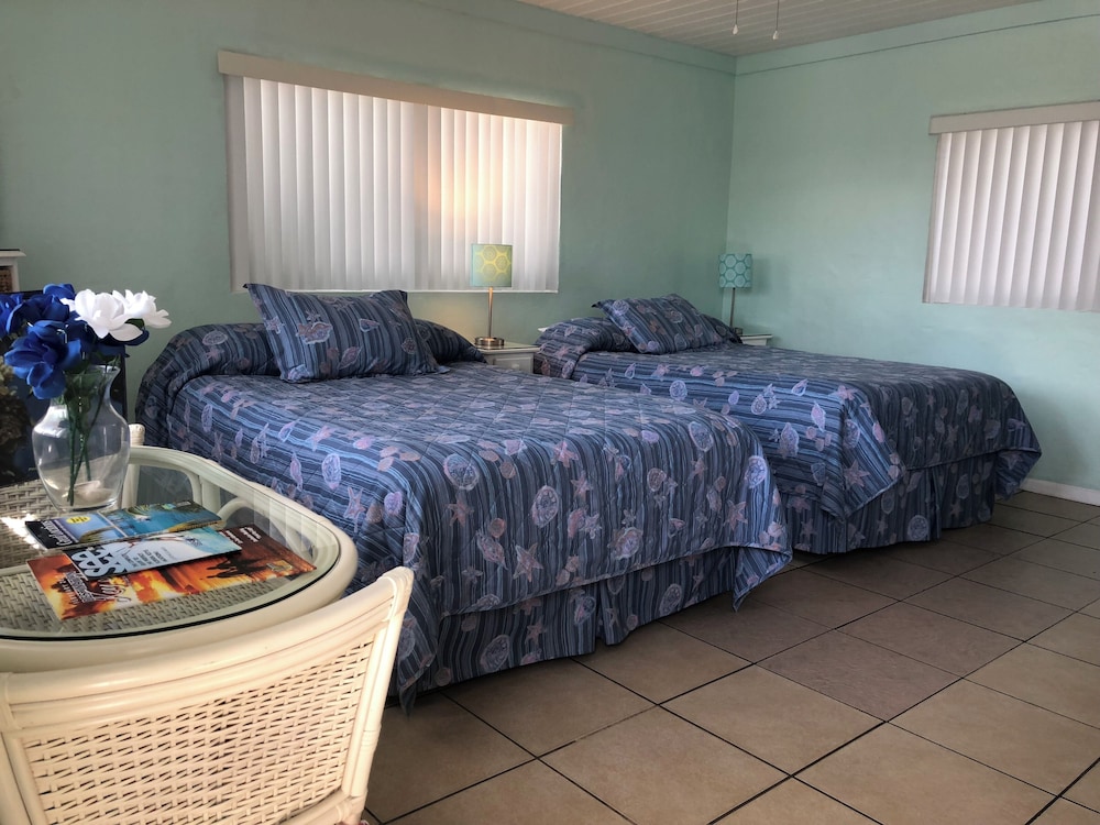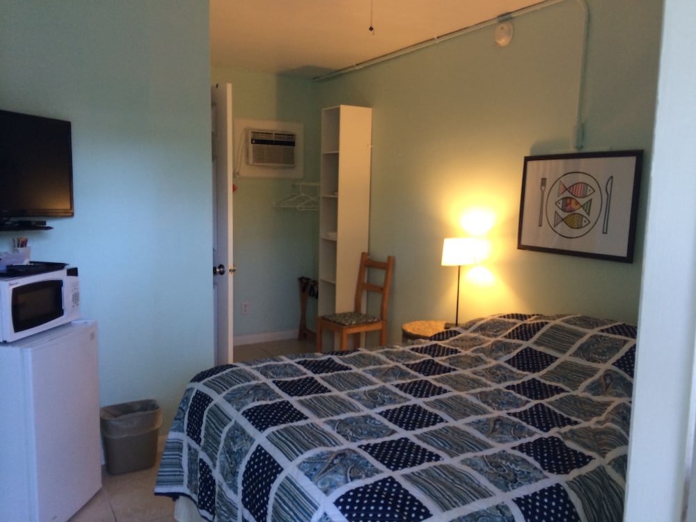 This quiet, secluded resort was built in the 1950's, but is in surprisingly great condition. We booked a garden room with 2 queen beds, which is basically half of a cottage. The grounds were beautifully shaded with lush landscaping. The room wasn't very spacious, but was good enough for a short stay. It had a small refrigerator and a rather ancient microwave, but both worked. The bathroom was small but well appointed and immaculate, with a basket of amenities on the toilet lid and plenty of clean towels. There was a tray of tea bags and instant coffee next to the microwave, but no in-room coffee maker. The beds were comfortable, and a smallish flat screen tv was on a dresser opposite them. Importantly, the a/c was working perfectly. There was a small breakfast buffet in a tiki hut between the cottages and boardwalk to the beach. It consisted of muffins, frittata cups, yogurt and coffee, but was plenty for us and tasty. After breakfast, we took the short boardwalk to the quiet beach with plenty of chairs, where we spent the day before enjoying a gorgeous view of the sunset. The owner/manager was pleasant and obliging. My only complaint is there is no ice machine on the property, which has been a pretty basic motel amenity all of my life. There was a plastic ice tray in the refrigerator, but it never got cold enough to make ice. We could have gotten ice at the gas station, but didn't have a large enough ice chest. An on-site machine in the tiki hut would be great.