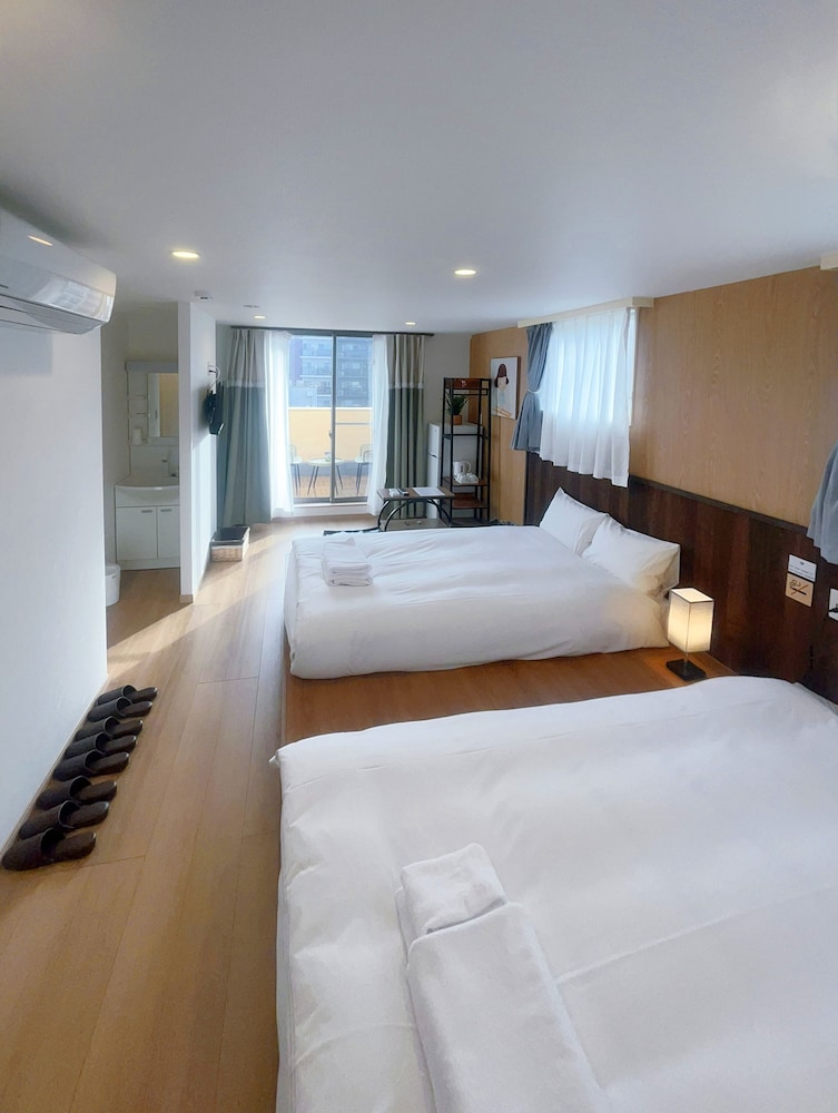 The room was so cool and refreshing on a very hot day. The beds were very comfortable and the water pressure and temperature was good. There is a shared kitchen and laundry on 2F, our room was 3F, only stairs, no elevator, but we packed light so that was not an issue for us. Just right for our 2 night stay.