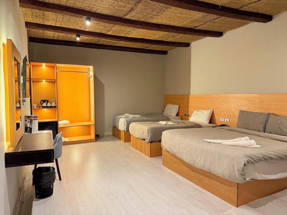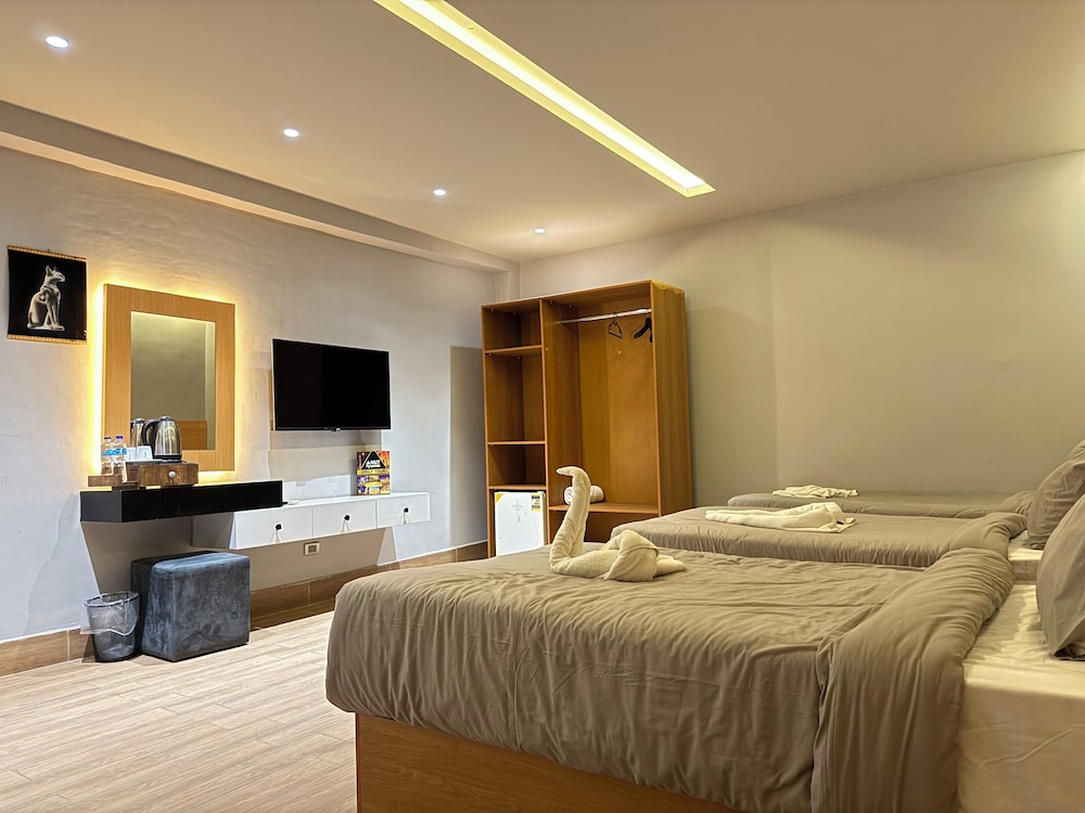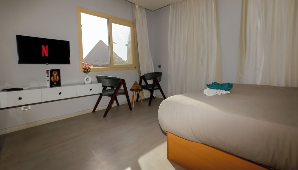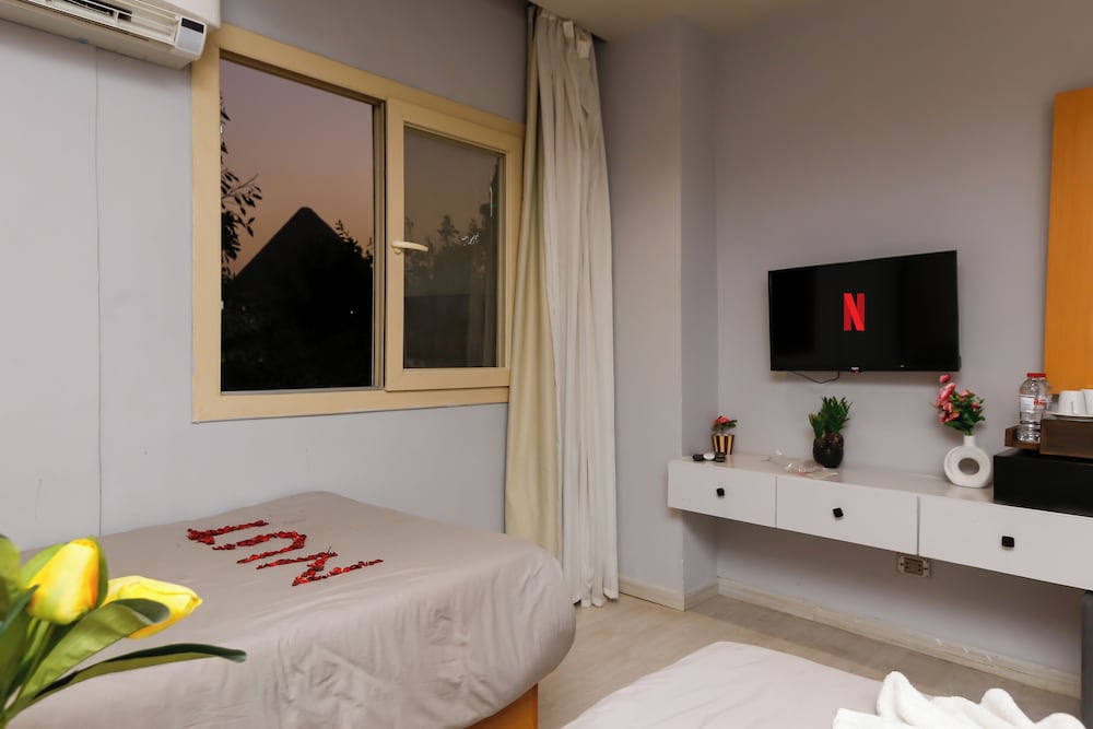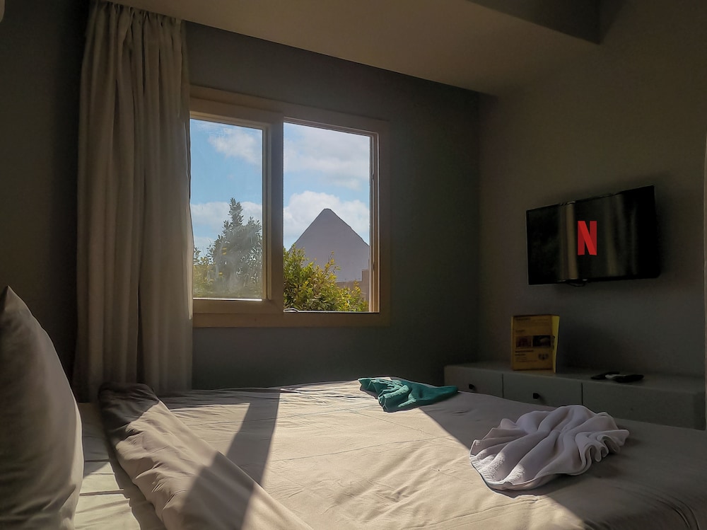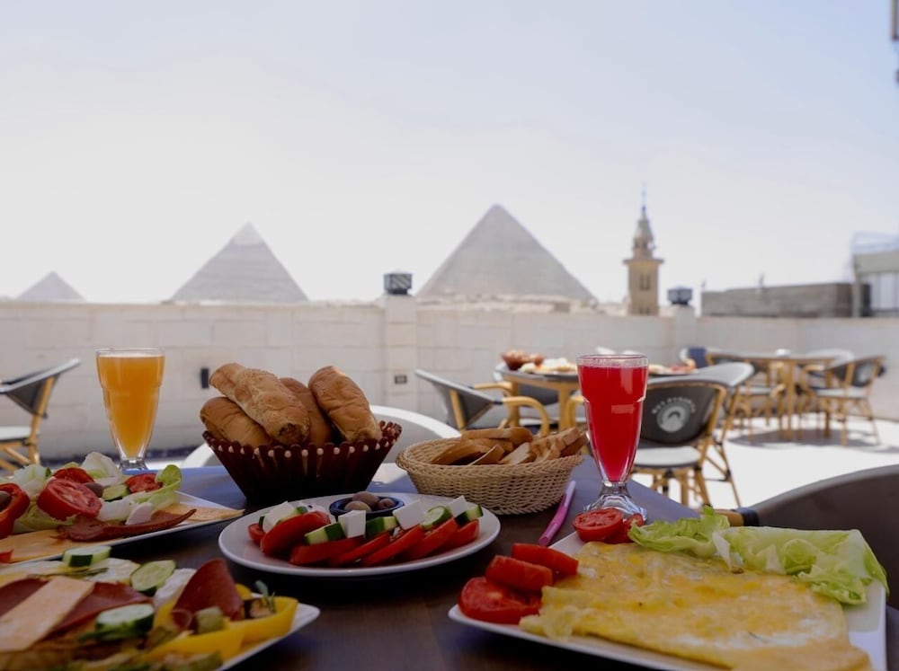 Todo en general muy bien, la propiedad esta limpia, las habitaciones cuenta con lo indispensable , las camas muy comodas. El desayuno tipico, variado y muy rico, con una vista increible a las piramides. Llegamos de madrugada ( 4 am), nos recibio Mamohud, quien muy amablemente nos mostro las instalaciones y nos permitio la vista de las piramides iluminadas, algo sorprendente al ser nuestro primer dia en Egipto y sobre todo lejos del caos y ruido del Cairo . Sin duda volveria