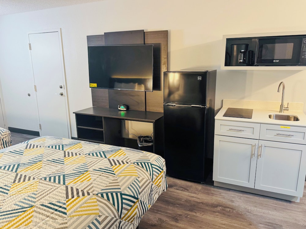 My room was one that had been remodeled. It was a single with one queen-sized bed. It was clean. The decor was simple but very nice. There was a lot of cabinetry to put your stuff in or on. The clock had convenient USB ports. In addition to the vanity wash sink, there was a deep bar sink, a two-burner stove, a microwave, a coffee pot, and toaster plus a full-sized fridge. I only needed the fridge. The bedside lighting was adequate for reading. The floor was not carpeted and had that new vinyl (easy to keep clean). There was an iron and an ironing board. The place for hanging clothing was adequate. The air conditioner/heating unit worked well. Were I to add anything it would be a small hair dryer.. My room was on the first floor in the back facing McDonalds. It wasn't too noisy. I will stay there again.