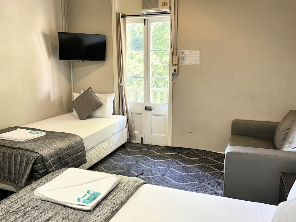 Great location with lots of parking. Room is lovely and clean. Communal Kitchen facilities are great with stove, microwave and full fridge plus all utensils. Good for longer stays. They also provide bread, butter and toppings as well as cereal and milk. Staff really friendly. Historic hotel.