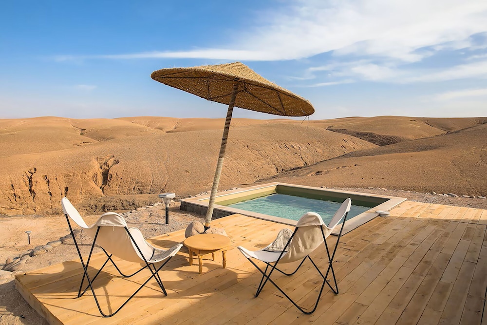 Le lieu est magnifique, niché au cœur du désert d’Agafay, avec une vue à couper le souffle et une ambiance paisible.