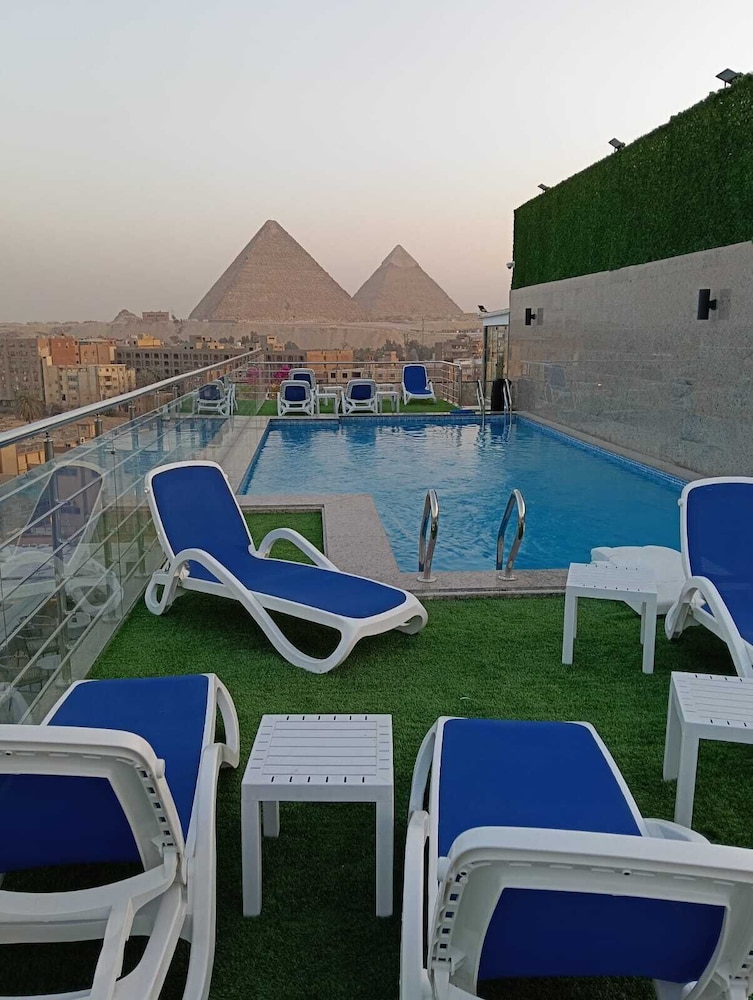 The view of the giza pyramids from the hotel rooftop was the only thing I enjoyed. Don't be fooled by the photos. Really not worth the stay. This is about a one star or no stars hotel. Outdated rooms. The shower in my room would not drain and was very filthy. The bathroom towels are old and as stiff as cardboard and rough as sandpaper. Two small water bottles are complimentary after that l had to purchase water at about one dollar US. The laundry service is overpriced, a small load will cost about 14 US dollars. The swimming pool towels are not replaced with fresh towels. Staff members simply collect the used pool towels and place them back on the towel stand. Complimentary breakfast is about the worst food I've ever had. I was not happy I made the choice to stay here. This is a very honest review. Pay the money and stay at a 5 star hotel. I wish i would have.