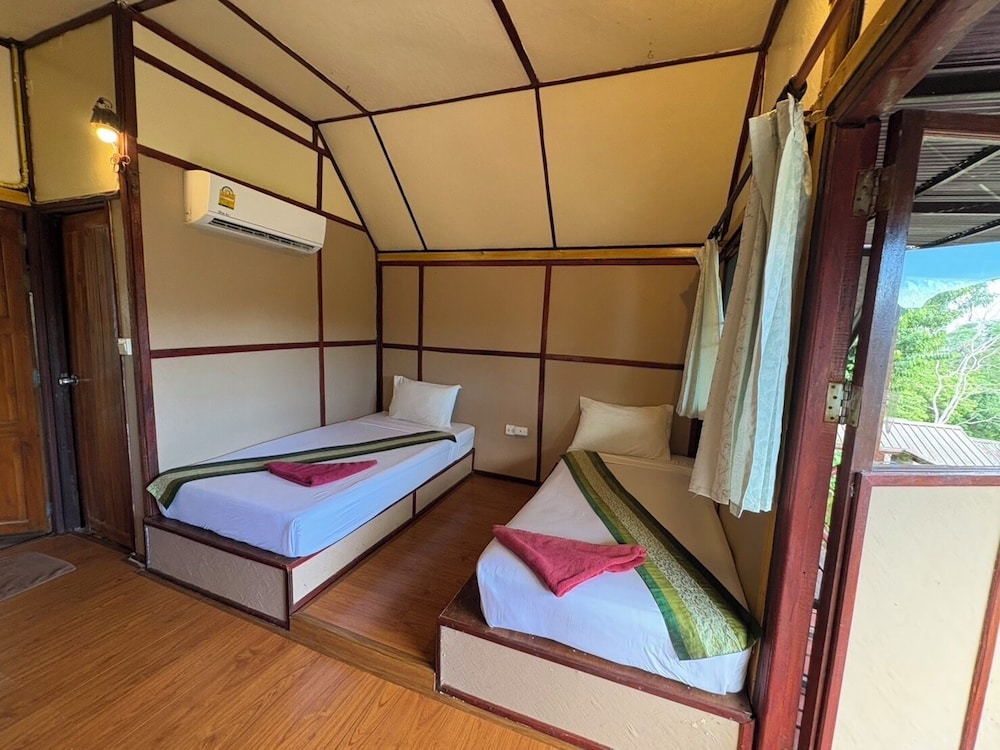 Wir hatten 2 DZ für 2 Nächte gebucht. Das terrassenförmig angelegte Resort ist Thai-geführt und liegt auf einer Anhöhe über einem Süßwasserspeicher (keine Mückenplage). Die DZ befinden sich jeweils in einer kleiner kleinen Holzhütte mit Dusche/ WC und Balkon mit Sitzgelegenheiten und Sonnenschutz in einem grünen, gepflegten Garten. Neben der offenen Lobby mit Restaurant ist der Pool. Das Frühstücks-Buffet wurde kostenfrei angeboten und bestand aus Toast, Butter, Erdbeermarmelade, O-Saft, Kaffee/ Tee, frische Früchte (Ananas, Wassermelone). Die DZ waren sehr sauber und gepflegt. Ein Minikühlschrank war jeweils enthalten. DAs Personal war stets freundlich und hilfsbereit. An der Rezeption kann man auch Ausflüge buchen, z.B. Halbtagesausflug nach Phi Phi Ley (Monkey Beach, Shark point snorcheln, Lagune, Maya Bay Beach und Schnorchelstop, Sonnenuntergang/ Planktontauchen) inkl. Getränke, frische Früchte und Schnorchelequipment für 1100 THB p.P. (ca. 30€). Fährüberfahrten zu anderen Inseln können ebenso von dort aus gebucht werden.