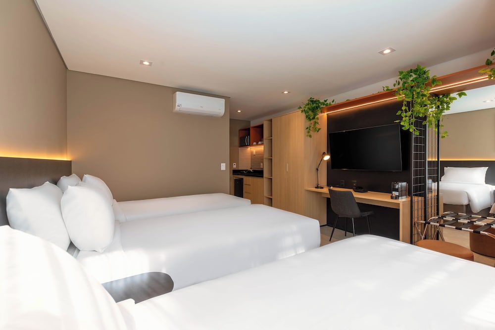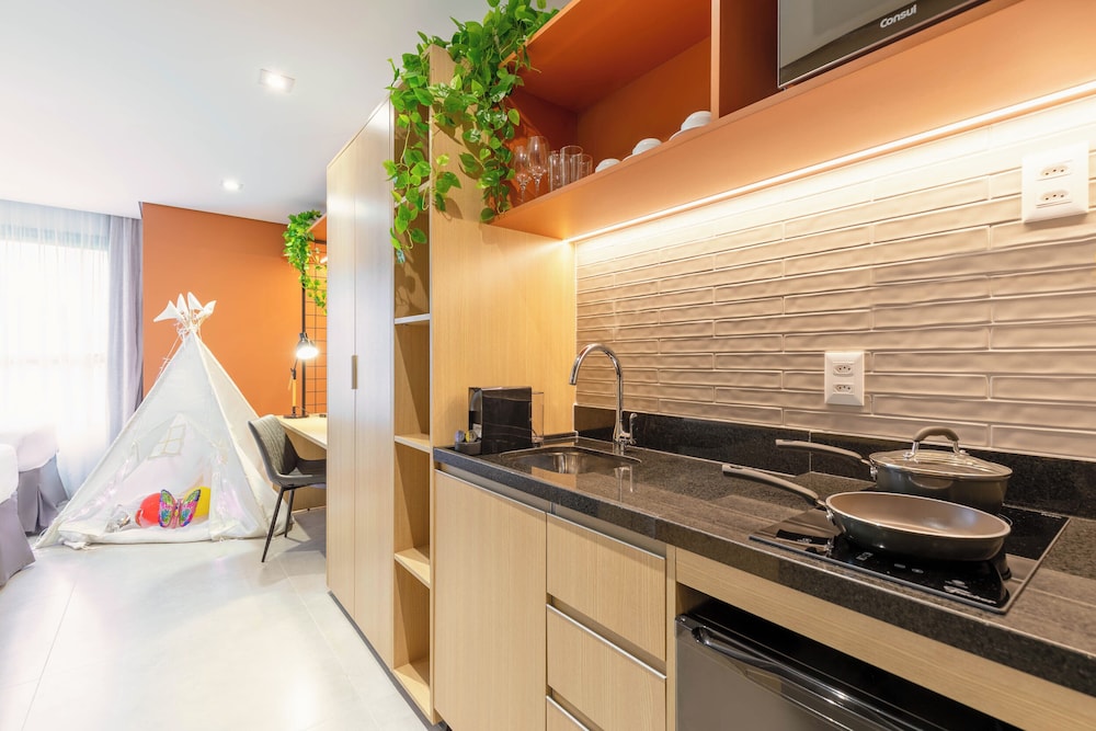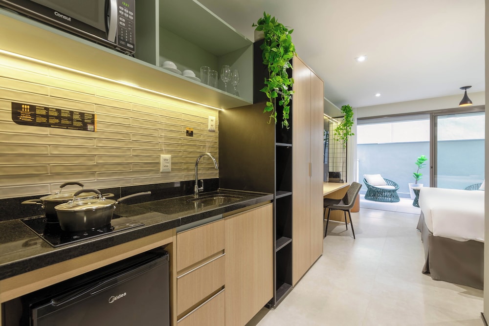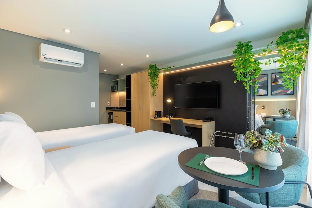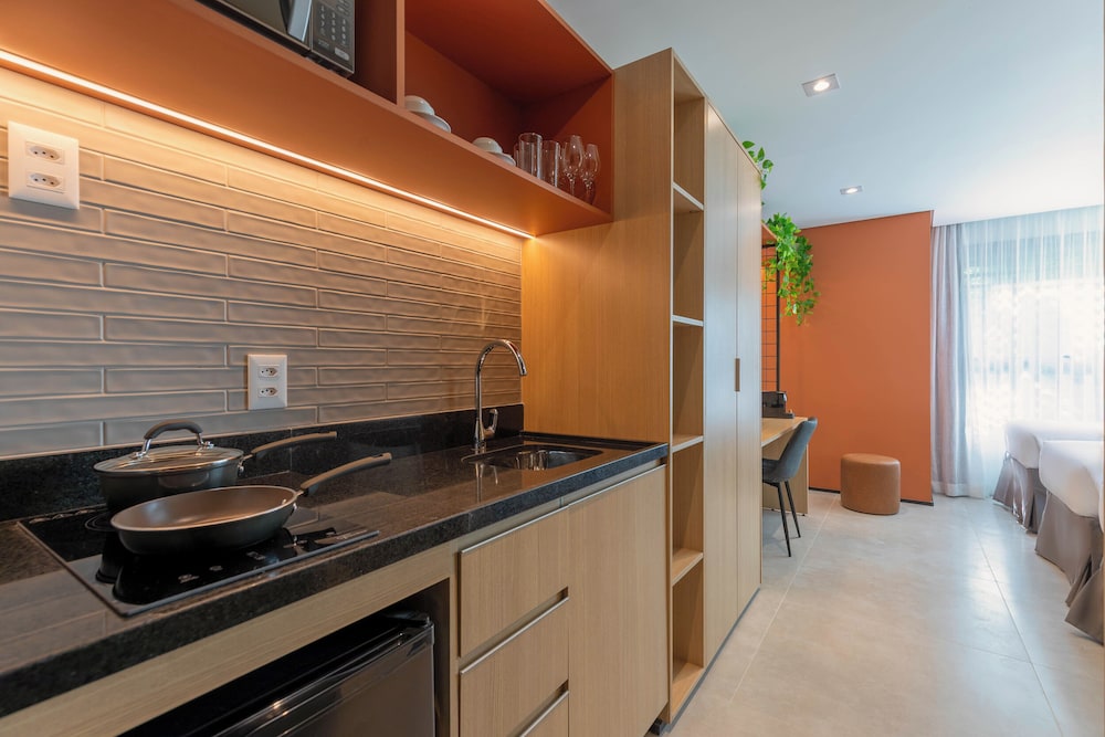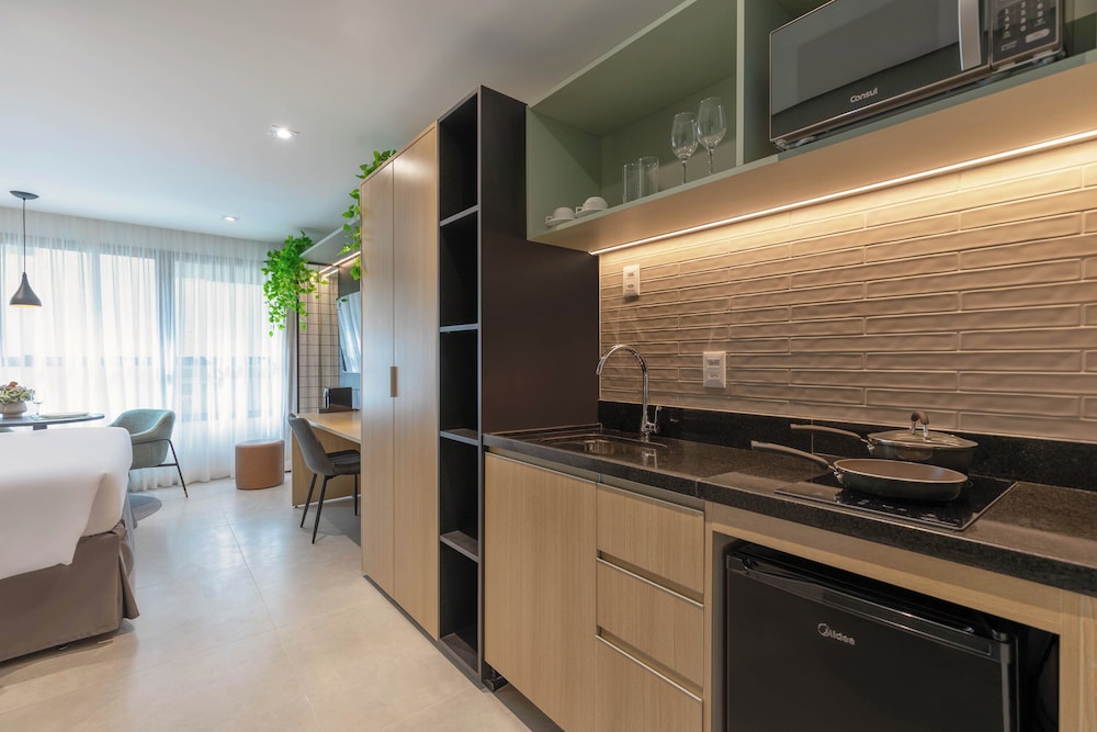 Hotel novo com quartos amplos e modernos. Atendimento excelente! Todos os funcionários são muito prestativos e simpáticos. A opção de cozinha é ótima porque te dá mais flexibilidade para fazer as suas refeições. Café da manhã muito bom!