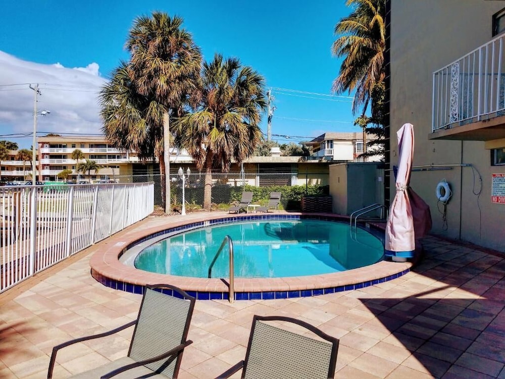 Great, relatively inexpensive option. There was a coin laundry right outside our room. Dryer was $2 for like 30-45 minutes. Almost nobody at the pool, and it has a nice view of the canal. Our room didn't have a fridge or a trashcan for some reason, but there were huge trashcans with the laundry area. I chose mostly for the ample free parking (had two cars and lot was only half full) and proximity to beach. Would definitely stay here again.