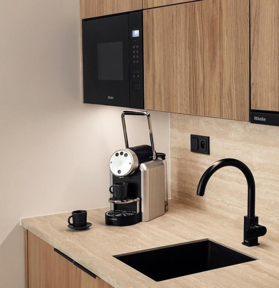 My family of 4 stayed in a 2 bedroom Mezzanine apartment. It was spotless, lovely, & spacious. The kitchen was stocked with a Nespresso maker, toaster, stovetop, under the counter refrigerator & dishwasher. There is a washing machine & iron also. The staff were very helpful and kind. The location was great, about an 8-10 minute walk to Old Towne. The property is an easy 15-20 minute walk from the central train station and 20 minute Uber ride to the airport.
