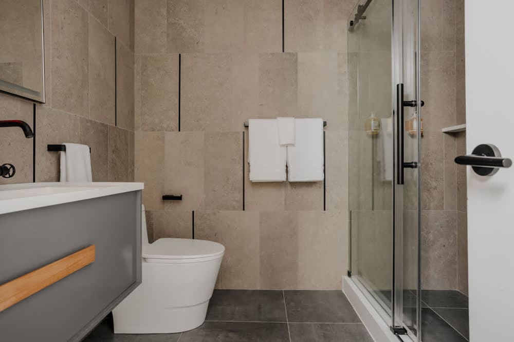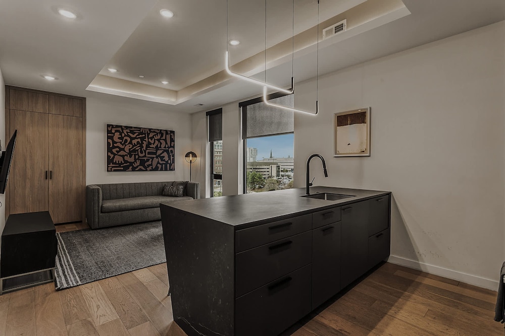 Enjoy a fully equipped kitchen and chic decor in your apartment, complemented by access to an inviting roof deck, a state-of-the-art gym, and convenient laundry facilities for a seamless stay.