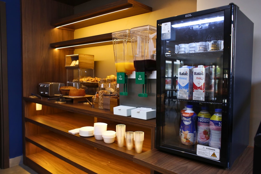 O quarto tem à disposição além do frigobar, microondas. Cama confortável, ótimo chuveiro. Não tem cortina blackout e o café é simples.