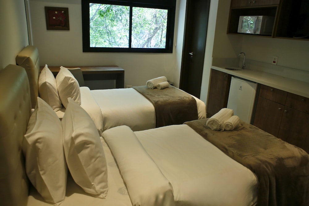 Fiquei decepcionado, pois as instalações são boas (bem novas), a equipe procura ser simpática, mas há falhas graves na operação (exemplo: o quarto tem frigobar, microondas, uma pia, armários e bancada, mas nenhum utensílio - pedi talheres emprestados, e houve recusa, sob alegação de que não existiam - me pareceu surreal, pois nem mesmo um copo descartável).