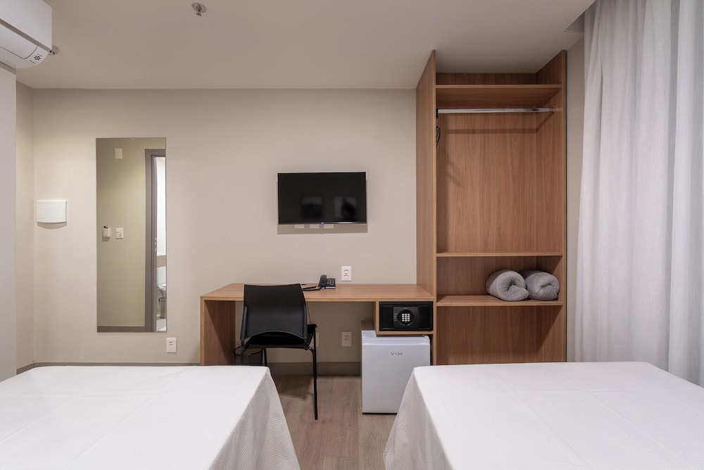Apesar de pequeno, o quarto é arrumado. Tudo em ordem. Faltam copos para água.
