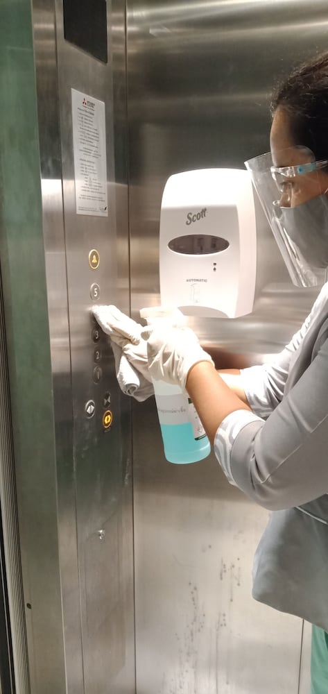 Commonly-touched surfaces are cleaned with disinfectant