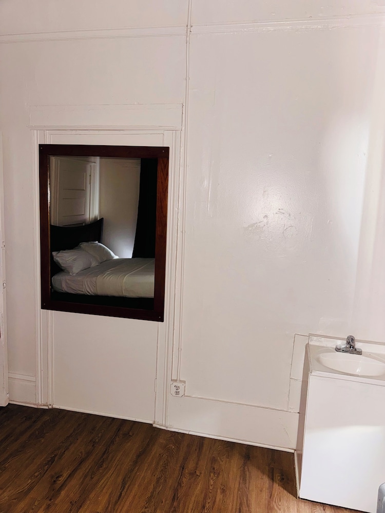 Less than bare minimum for a hotel room! The room was 90 with no AC while it was 60 degrees outside. There was a single usable outlet for the whole room, the cracked window opened but no screen so bugs would fly in if you choose to open it to try to cool your room off, there's a TV but no reception, a sink but only a community bathroom, barking dogs from down the hall despite the no pet policy, the hotel number doesn't work so don't waste your time trying to call, homeless people craping feet from the front door!