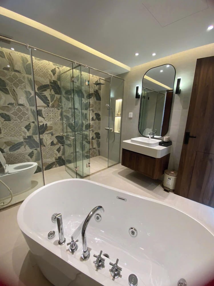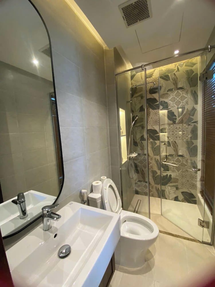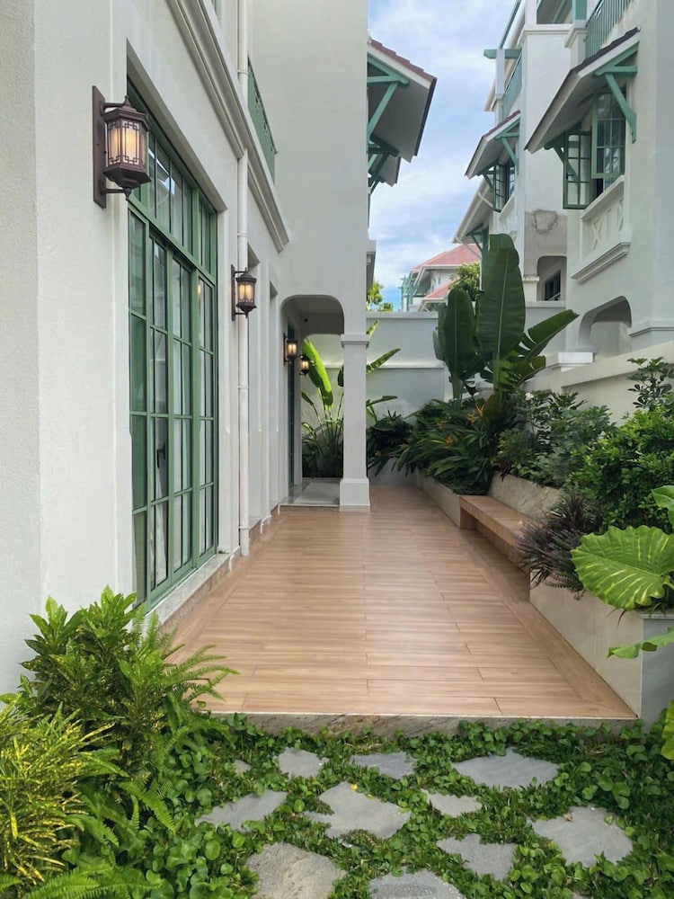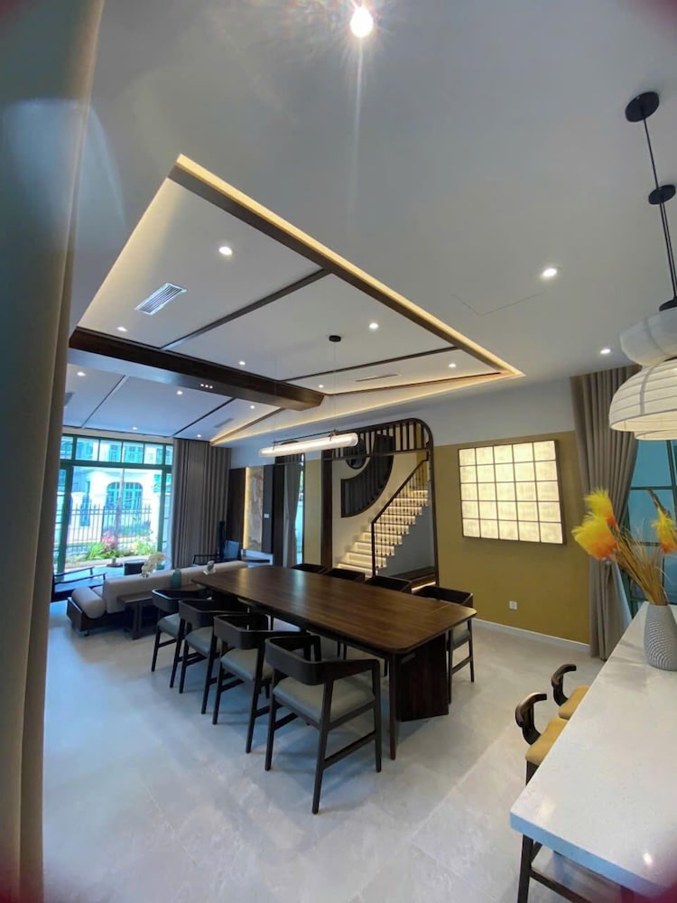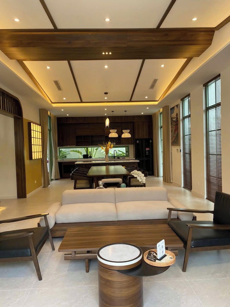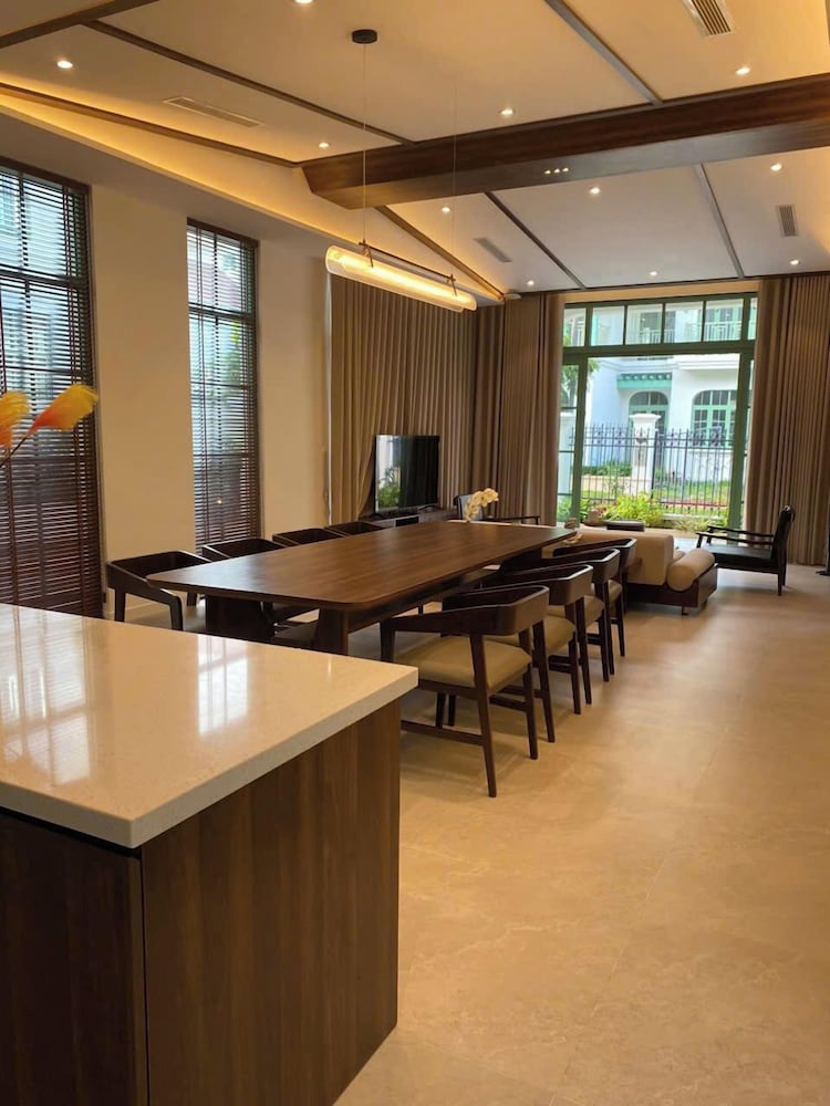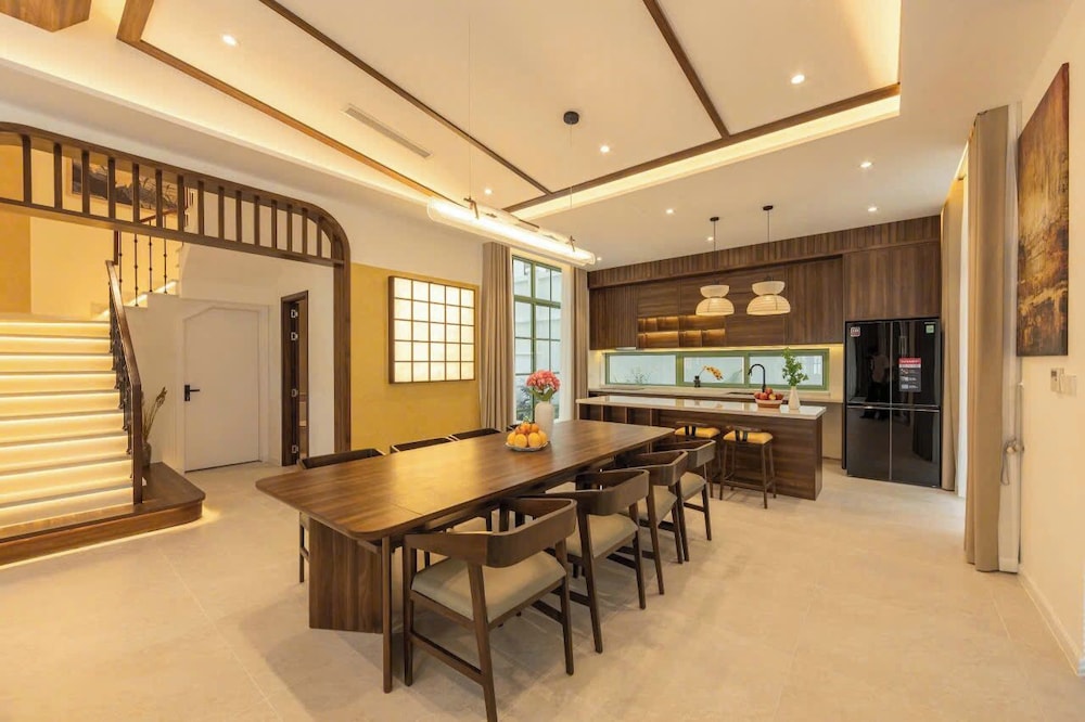 The Villa is very new. It was very clean with a modern Japanese style decor. There was ample room for our family of 9. Everyone had a bed to sleep in. We never felt crowded. This is a big villa. The community is very new and there is on going construction noises. We were surprised by it all at first because there was no mention of construction noises in the booking details. It can be loud but not enough to bother us as we were never around the villa. The villa is a great value because it is still in development. The staff and Ngoc the manager were very helpful. Anything we need they were always there to help. She sent a big passenger van to drop off and pick us up at the airport at no charge. It was very nice of her. Overall, we had a wonderful stay. It was within walking distance to Khem beach. About 10 min. It’s not direct beach access. You go out of the security gate, turn right and within minutes you are at the beach. There are numerous cafe and banh mi shops on your walk there to enjoy. I will definitely book here again in the future and I hope the waterpark and the rest of the community will be completed. It would make the place fantastic!