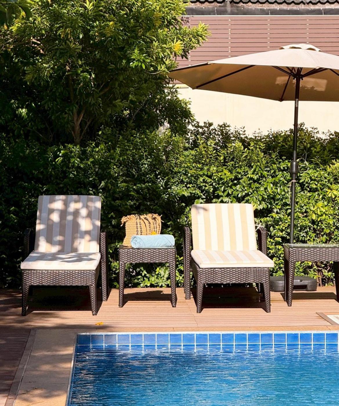 Der Poolbereich ist ansprechend gestaltet und man kann auf der Terrasse sitzen und auch essen.