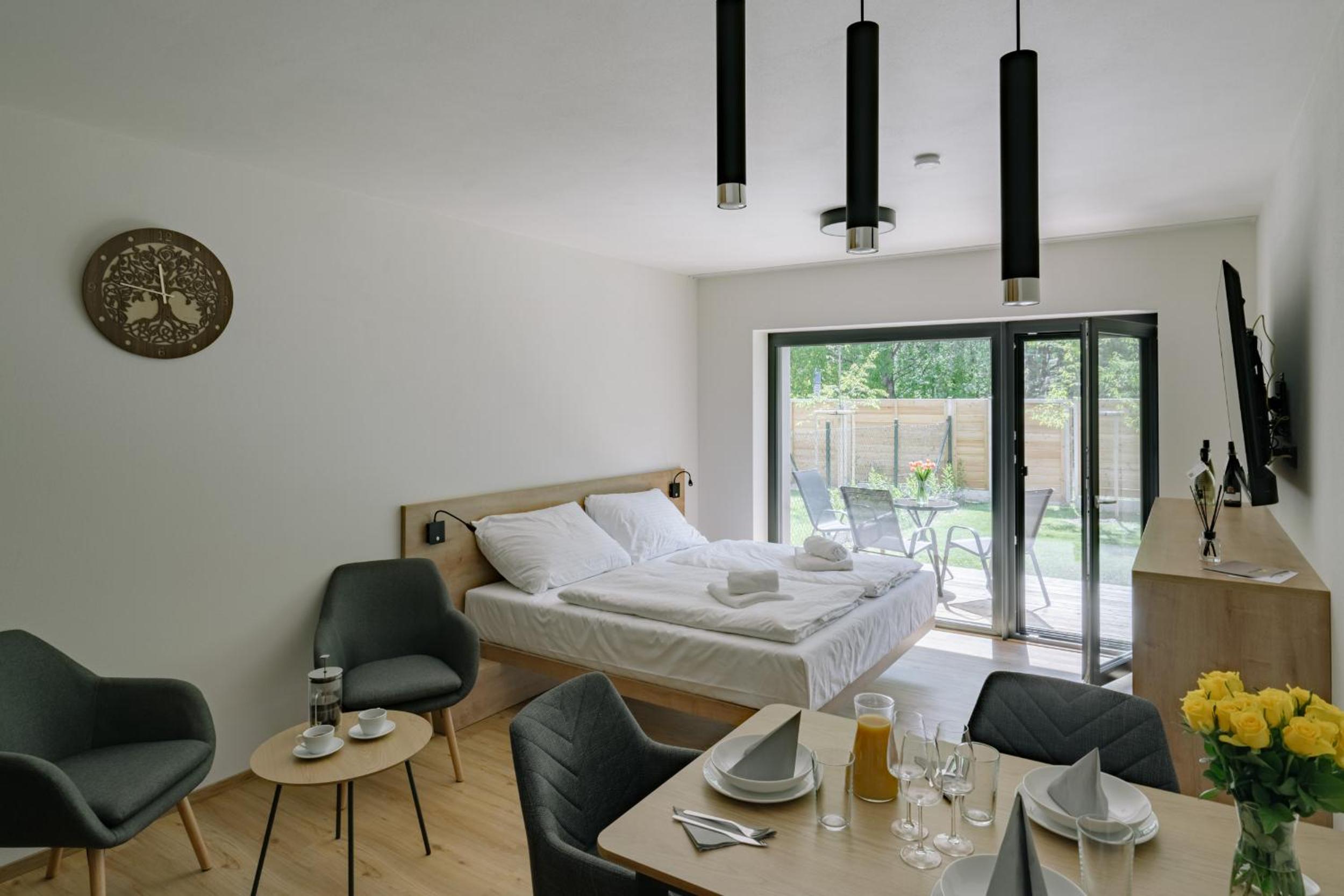 Our air-conditioned rooms offer stunning garden views and a private balcony, ensuring you relax in style. Enjoy the convenience of a fully equipped kitchenette featuring a microwave, dishwasher, and more, making your stay feel like a home away from home.