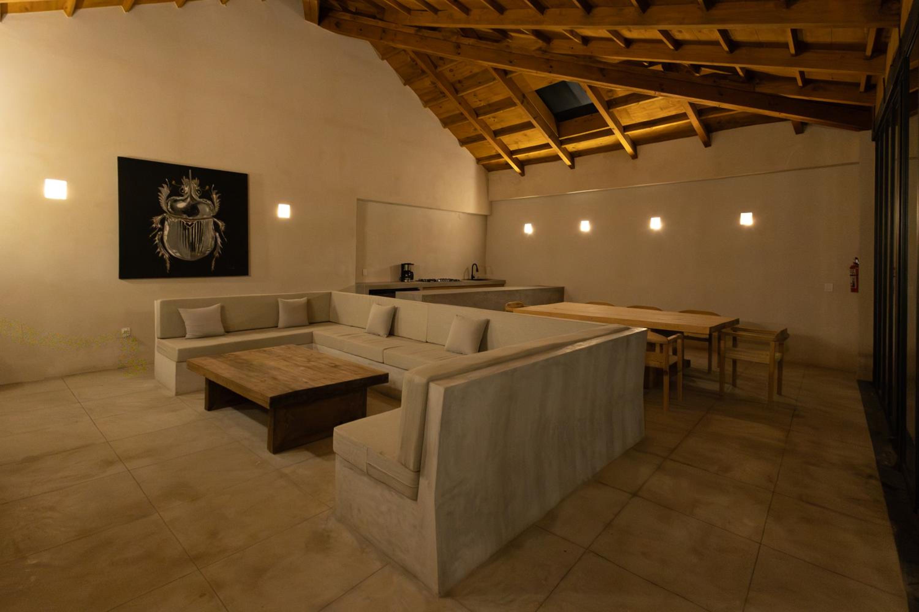 The place seems to be created for looks rather than use. A lot of the furniture was quite uncomfortable: The concrete couch and its odd massive pillow left little room to sit, the really high concrete table.. The fireplace is more of a gimmick than an actual working fireplace. Acoustics are quite bad so you have to be lucky with your neighbours.