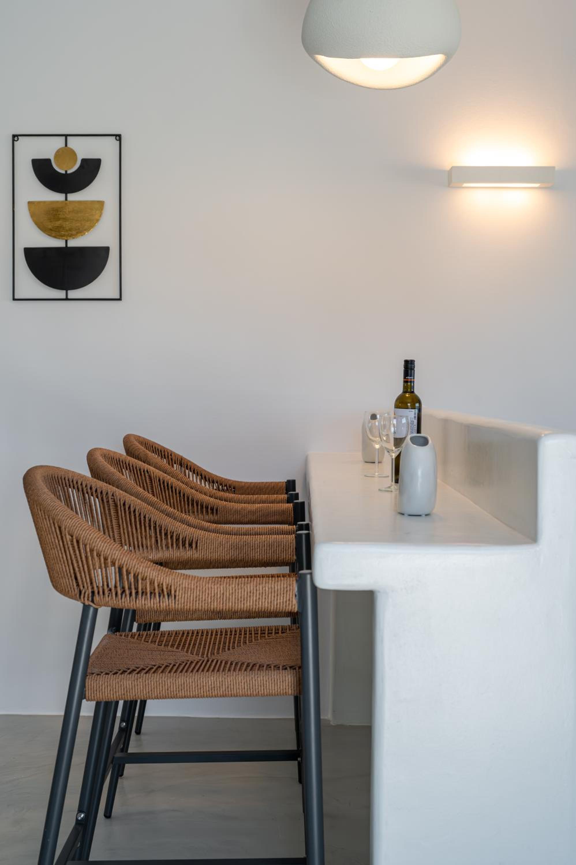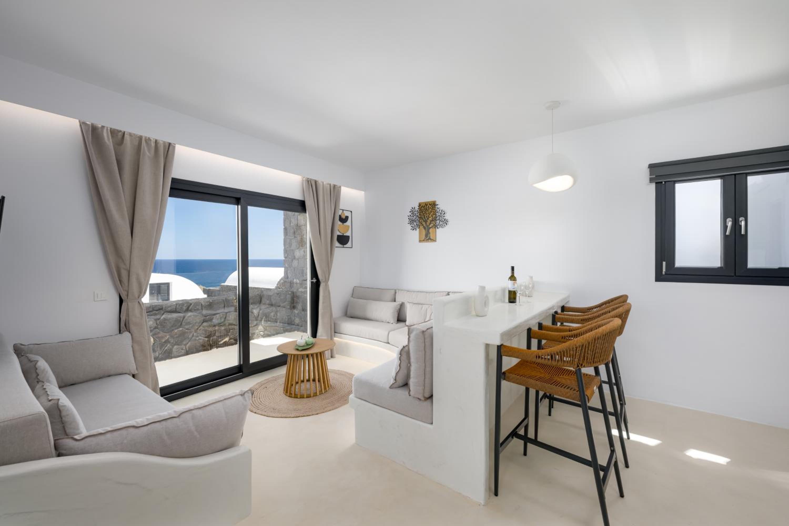 These dreamy houses are perfect for couples or anyone seeking peace and relaxation away from the busy parts of the island, yet still wanting to explore all the famous sights by a short car ride. Each unit has two floors, both featuring sea-facing balconies that offer a beautiful sunrise every morning. The kitchen area is fully equipped and has everything needed for a comfortable stay. Everything was impeccably clean and thoughtfully arranged.