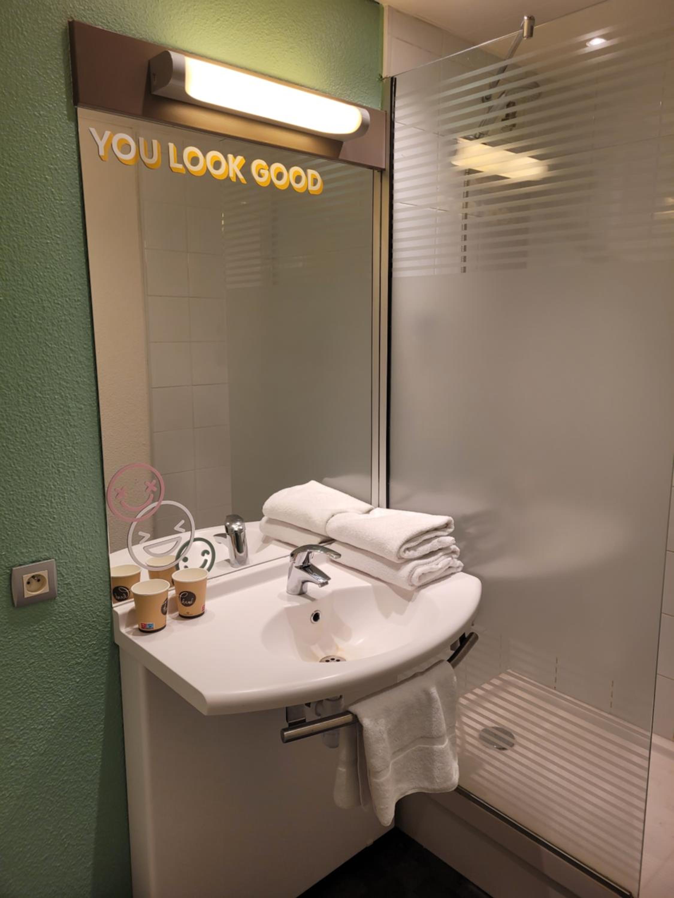 L'hôtel est très bien placé, à la sortie de l'autoroute. Le parking est grand et il est donc facile de se garer. La chambre est spacieuse avec un petit micro-onde et un frigo ce qui est très pratique.