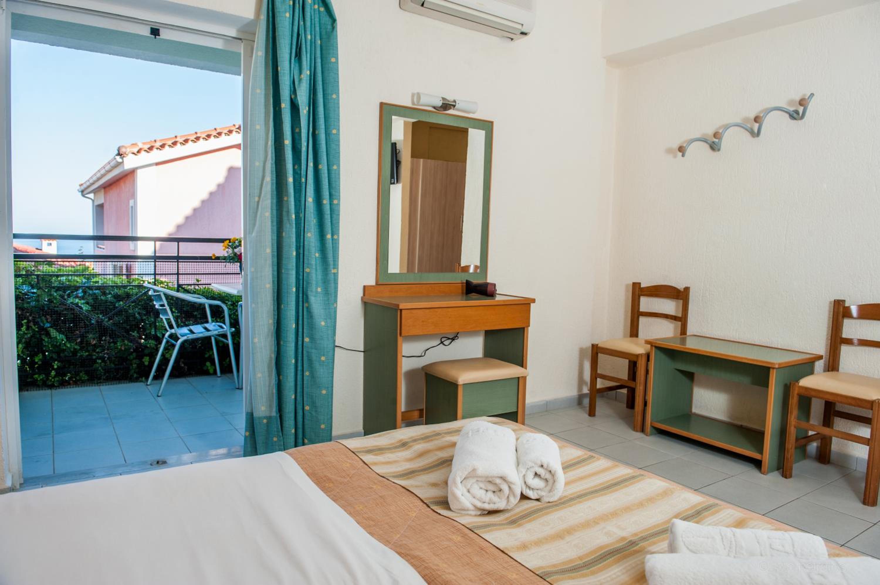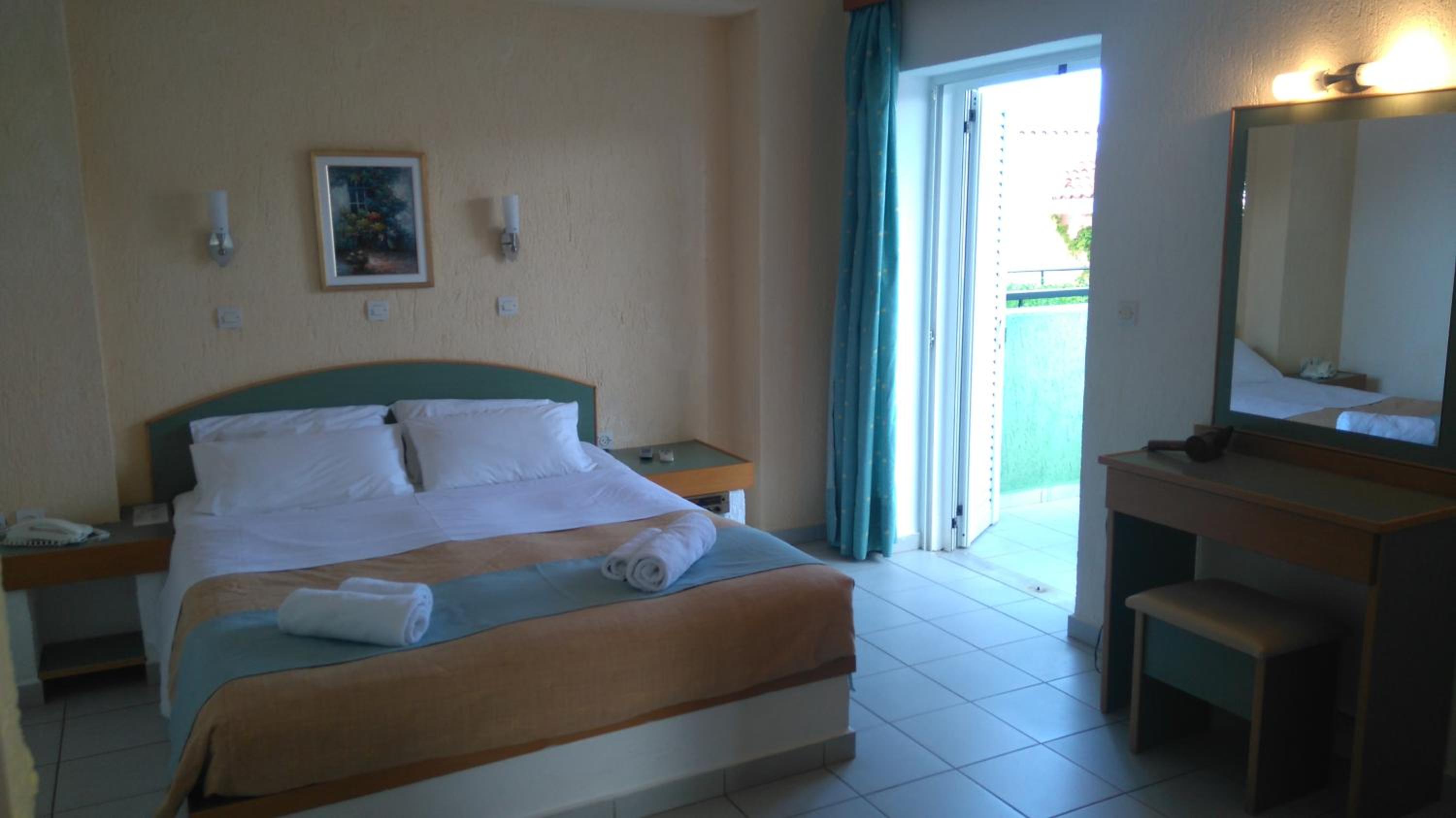 Location outside of the centre of Skala but 2€ mini bus service into town was less than 10 mins. Room was spacious and balcony had a great view of the sea and the sunrise. Breakfast was adequate, pool bar and areas to drink and relax were really good. Evelyn on reception was an absolute diamond!