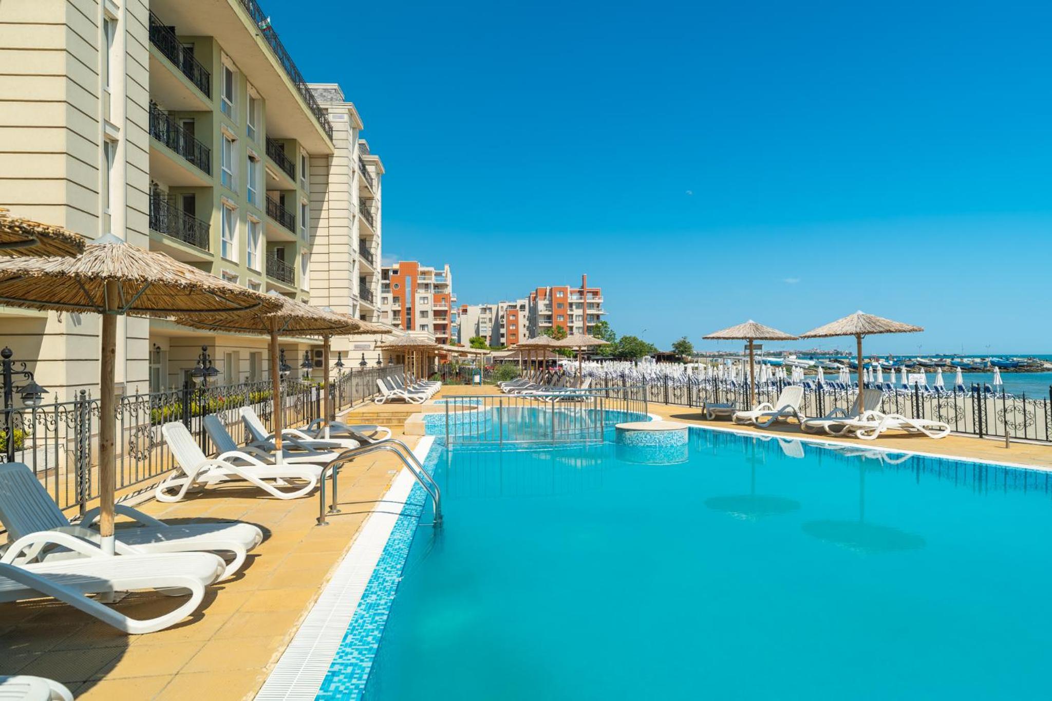 Welcome to the stunning 4-star Festa Pomorie Resort, your beachfront oasis on the picturesque Bulgarian Black Sea coast.