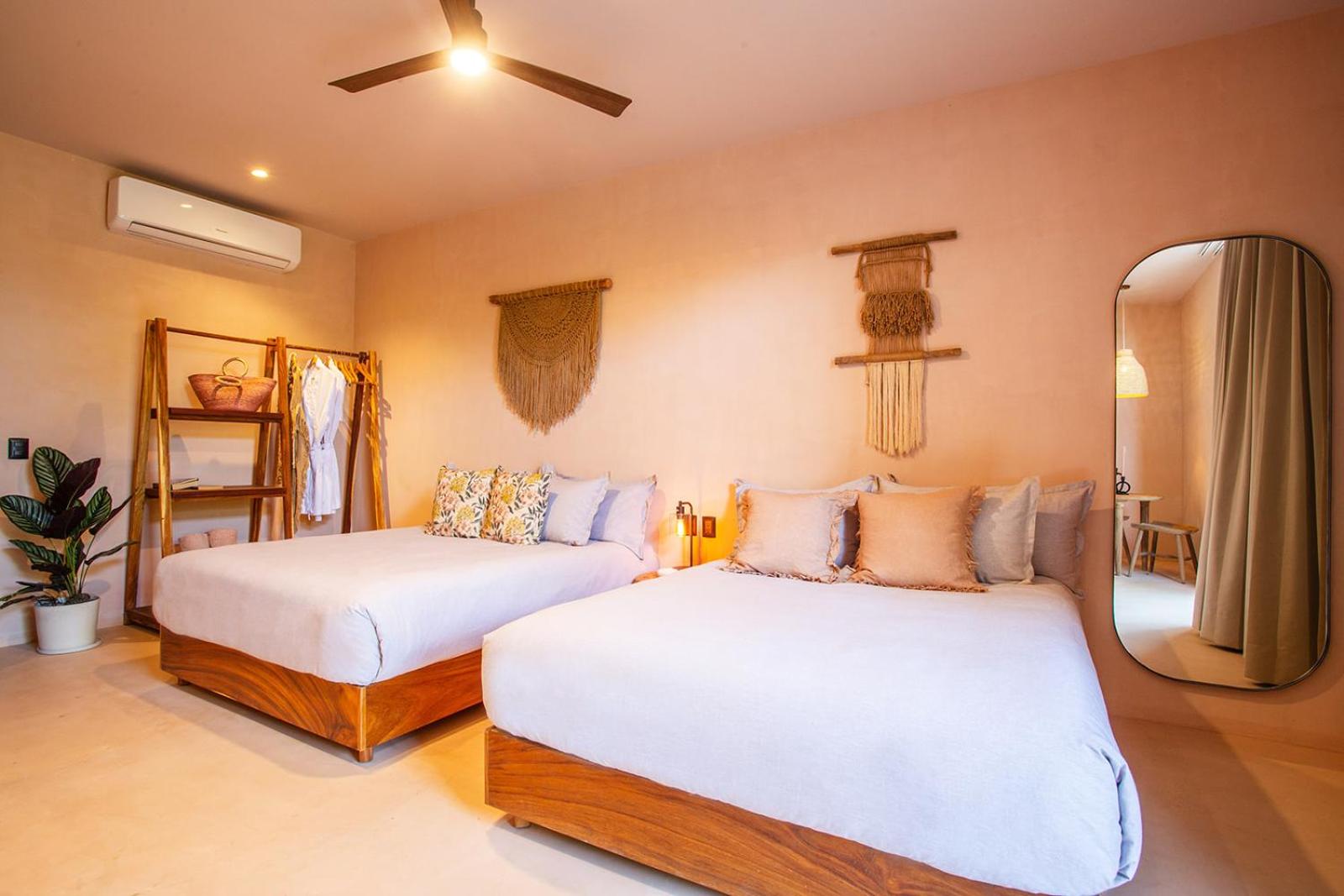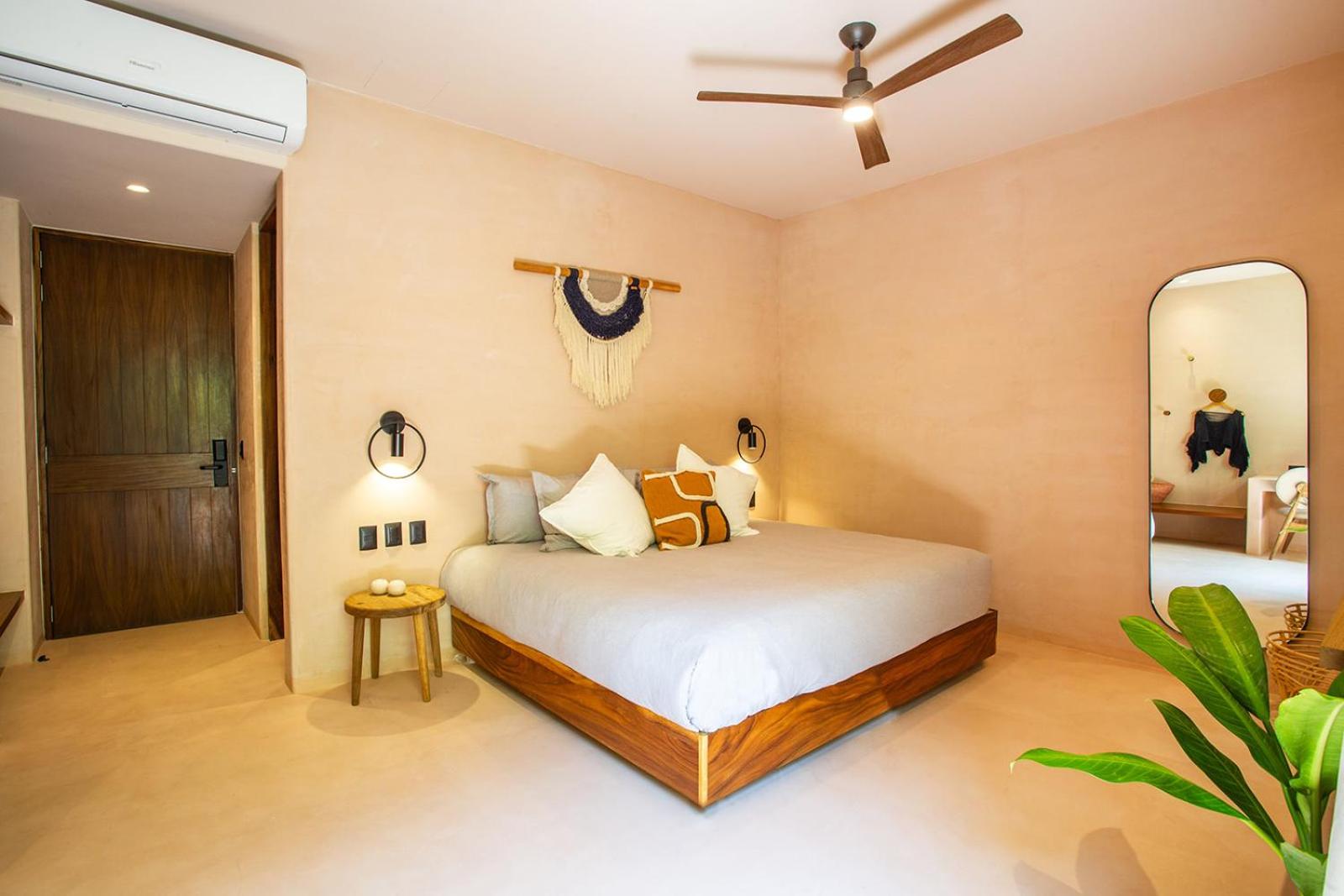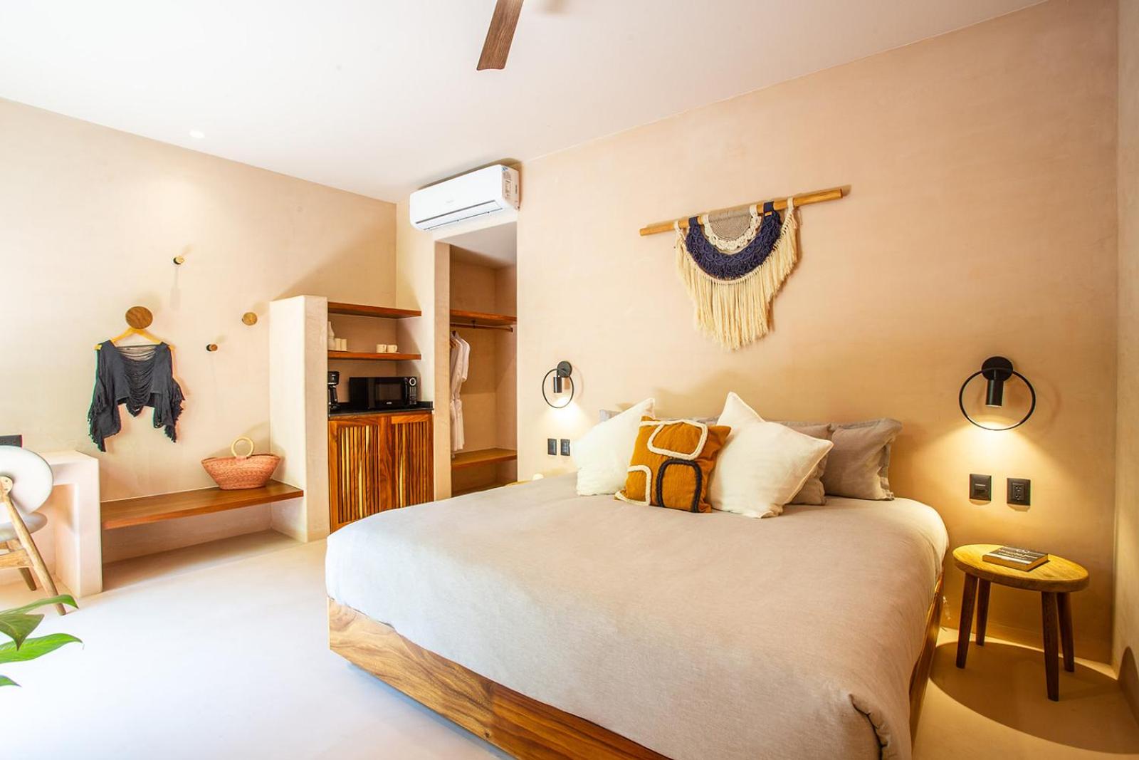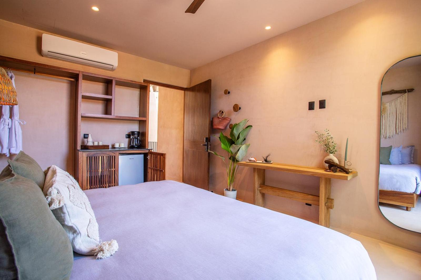 Location is further from the action and beach which is what I was looking for. Peaceful tranquil and I can easily walk within 5 minutes to the town and 9 minutes to beach. Main San Pancho can be noisy! Very comfortable beds with fluffy comforters. Wonderfully working ACs. Large room with nice day bed for hang out. Kitchenette with sink. Beautiful boho Tulum style chic.