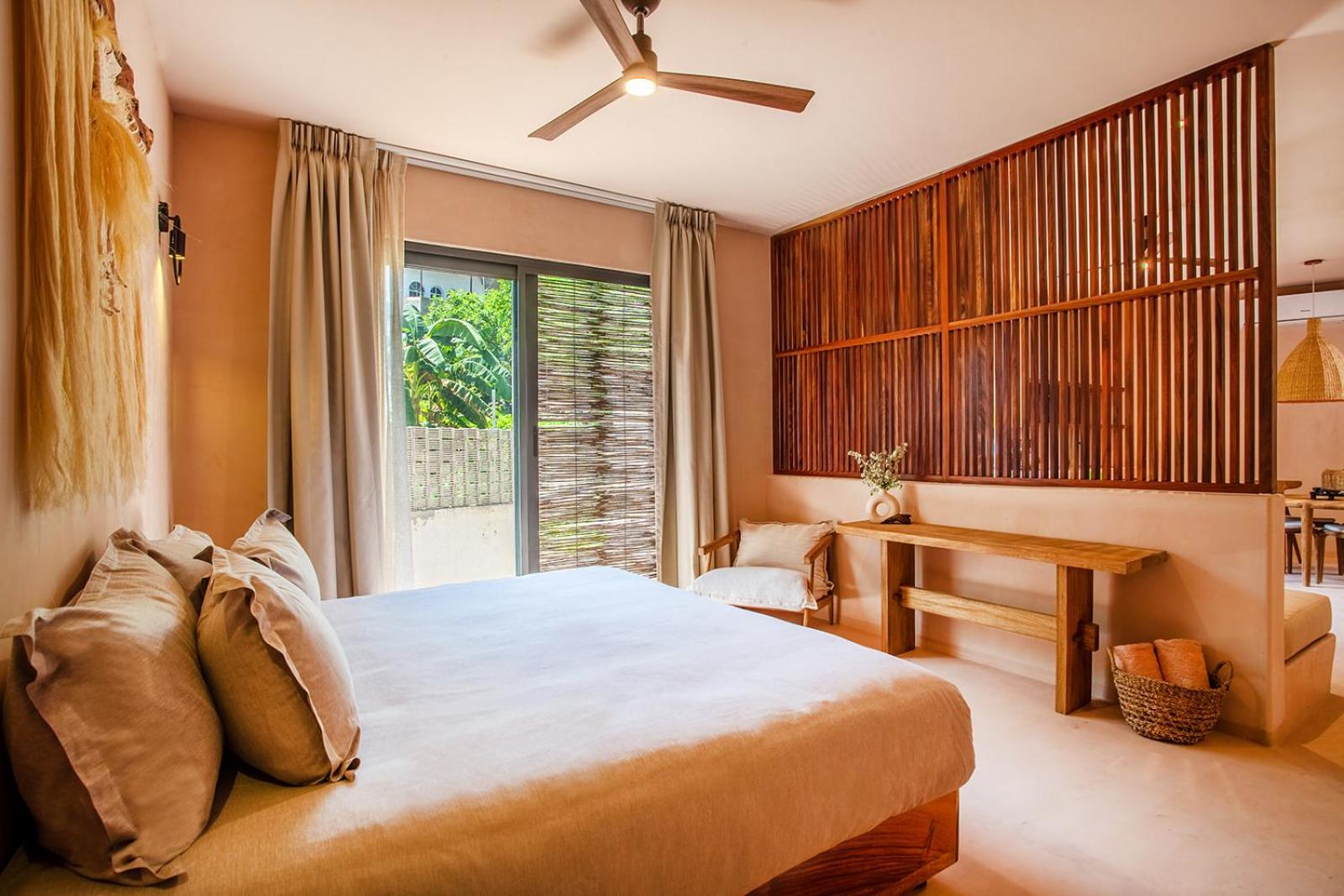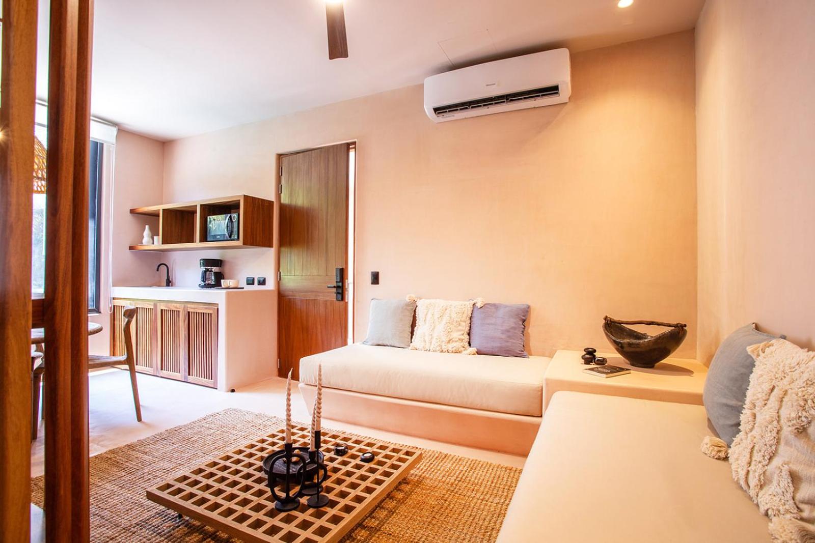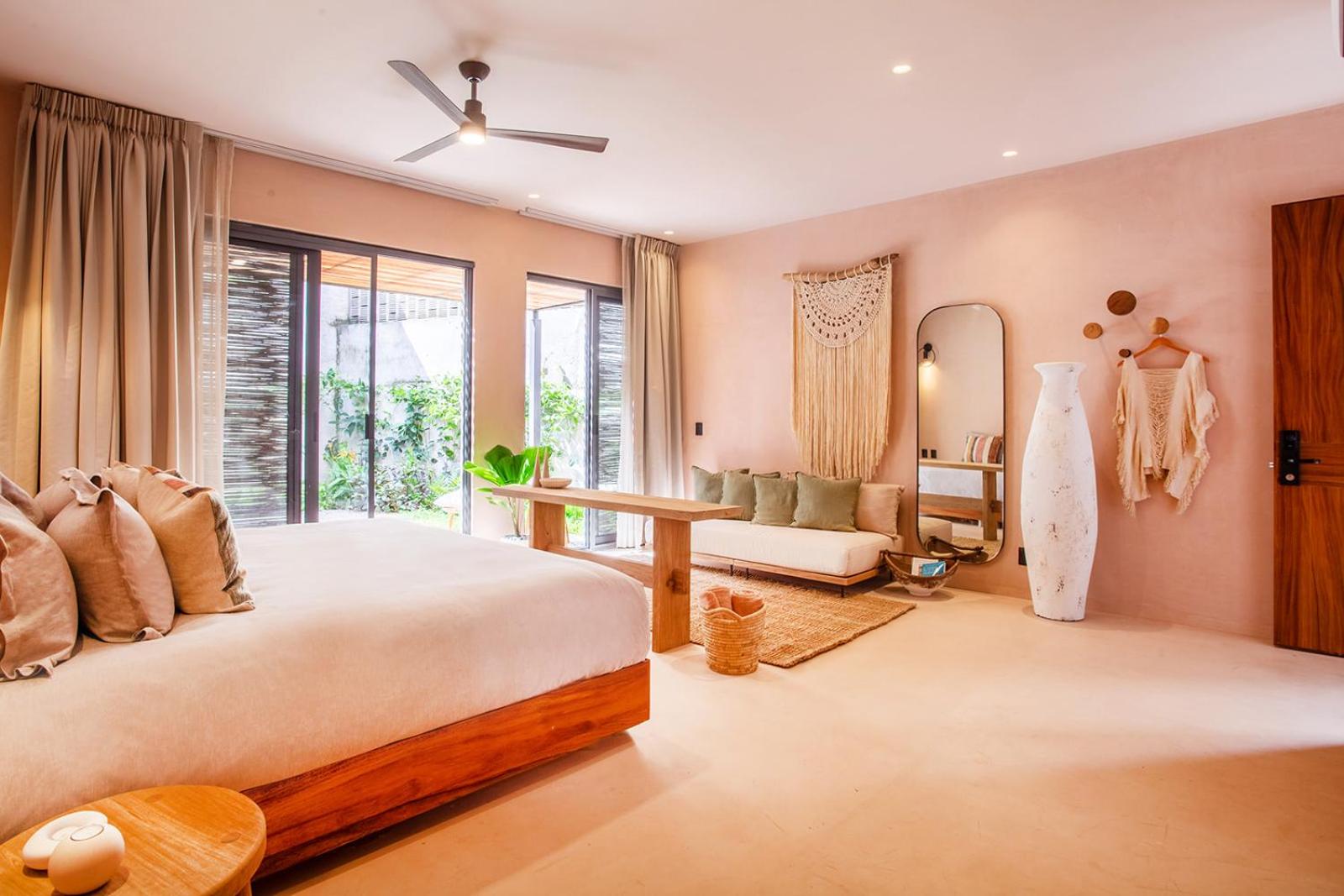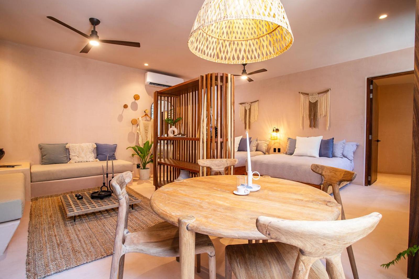 Location is further from the action and beach which is what I was looking for. Peaceful tranquil and I can easily walk within 5 minutes to the town and 9 minutes to beach. Main San Pancho can be noisy! Very comfortable beds with fluffy comforters. Wonderfully working ACs. Large room with nice day bed for hang out. Kitchenette with sink. Beautiful boho Tulum style chic.