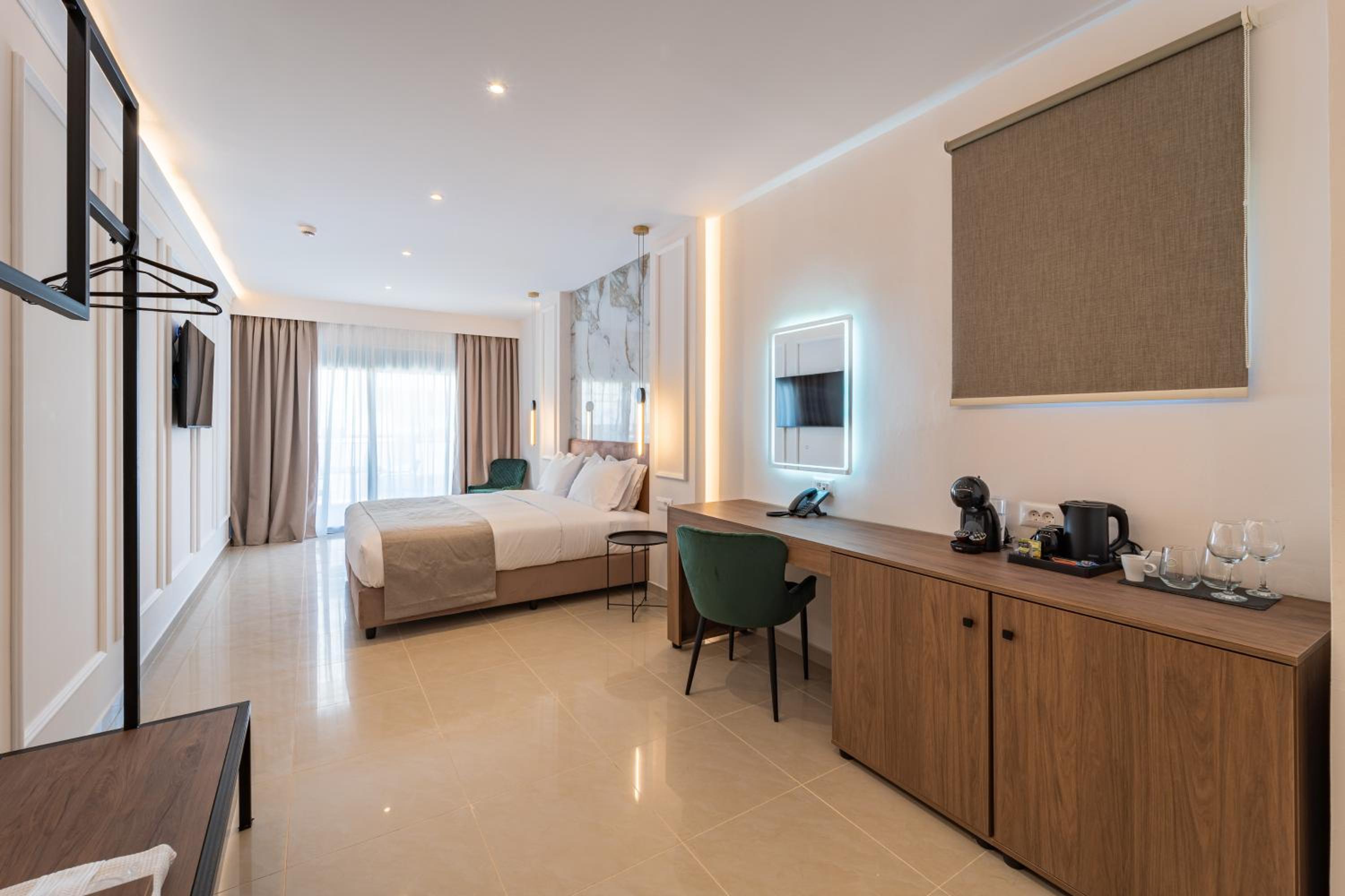 Exceptional Accommodations: Our elegantly designed air-conditioned rooms feature cozy amenities including a minibar, coffee machine, and flat-screen TV. Select rooms boast balconies with breathtaking sea views, ensuring a relaxing stay.