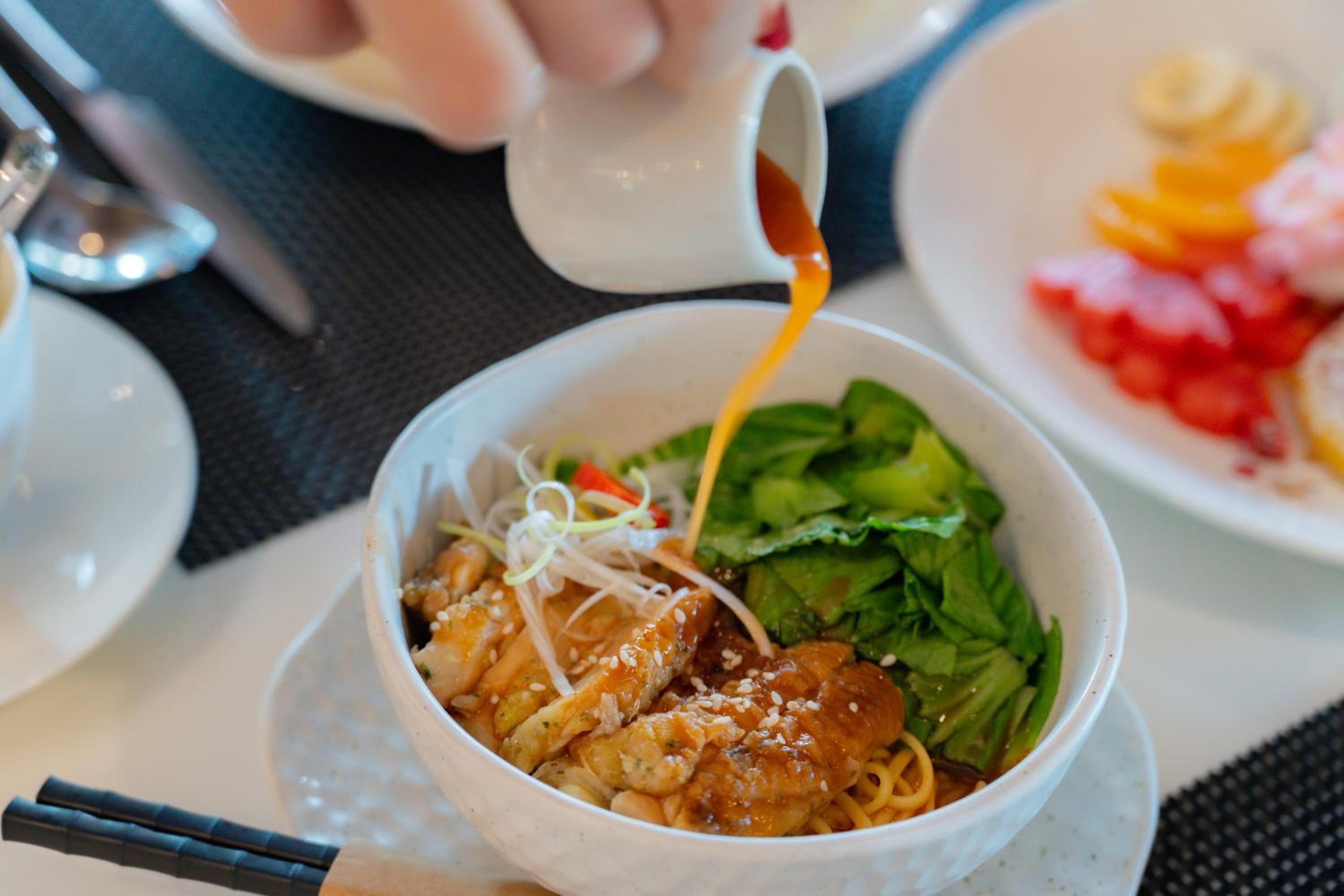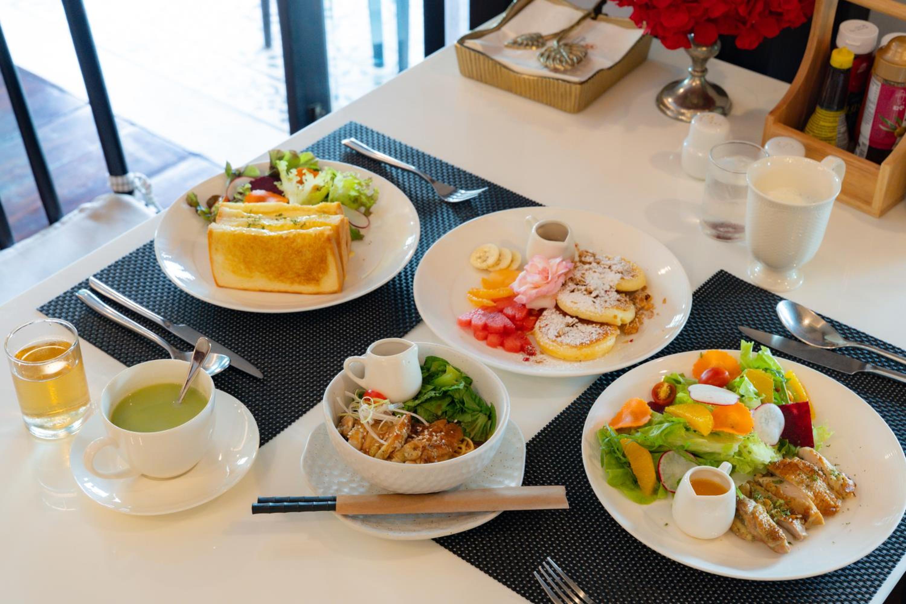 Savor a delicious breakfast with à la carte, continental, or American options, and indulge in our on-site restaurant featuring an exquisite blend of American and Thai cuisine. Gluten-free meals are also available upon request.