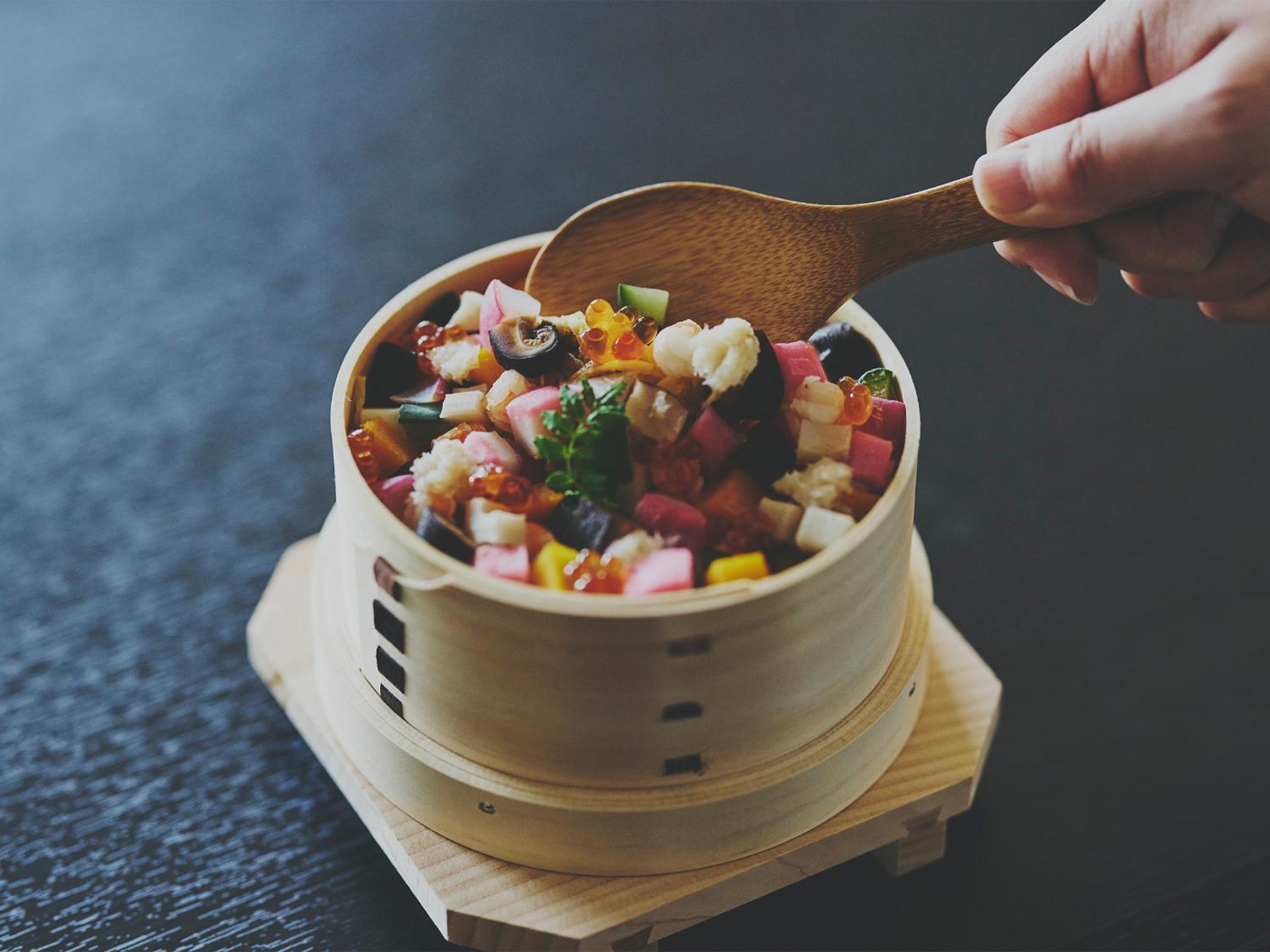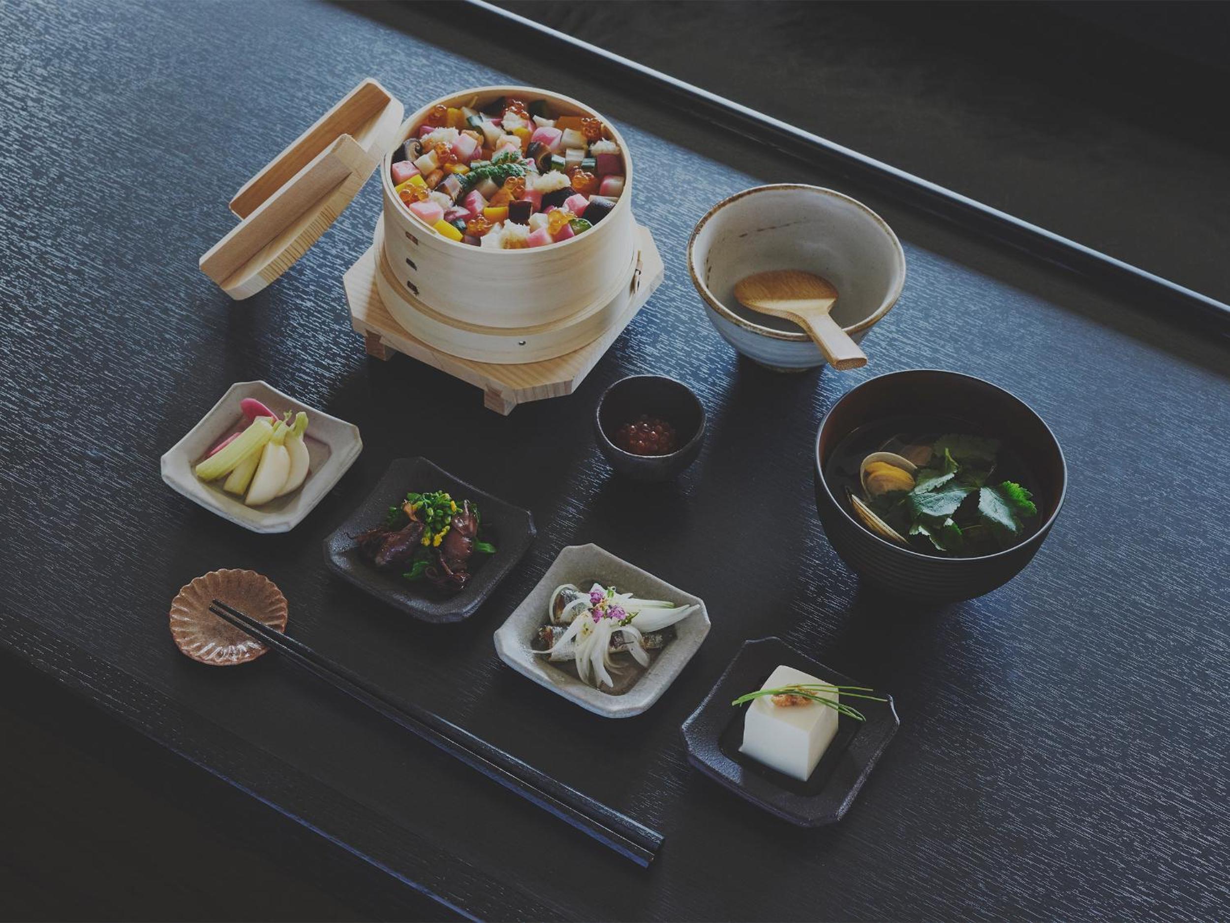 朝食が豪華で、水の上に浮かんだ小鉢を自分の好きなものを選んで食べられたり、バラ寿司が綺麗で美味しかった。地元の食材を使った朝食で、京都北部を体感できた。