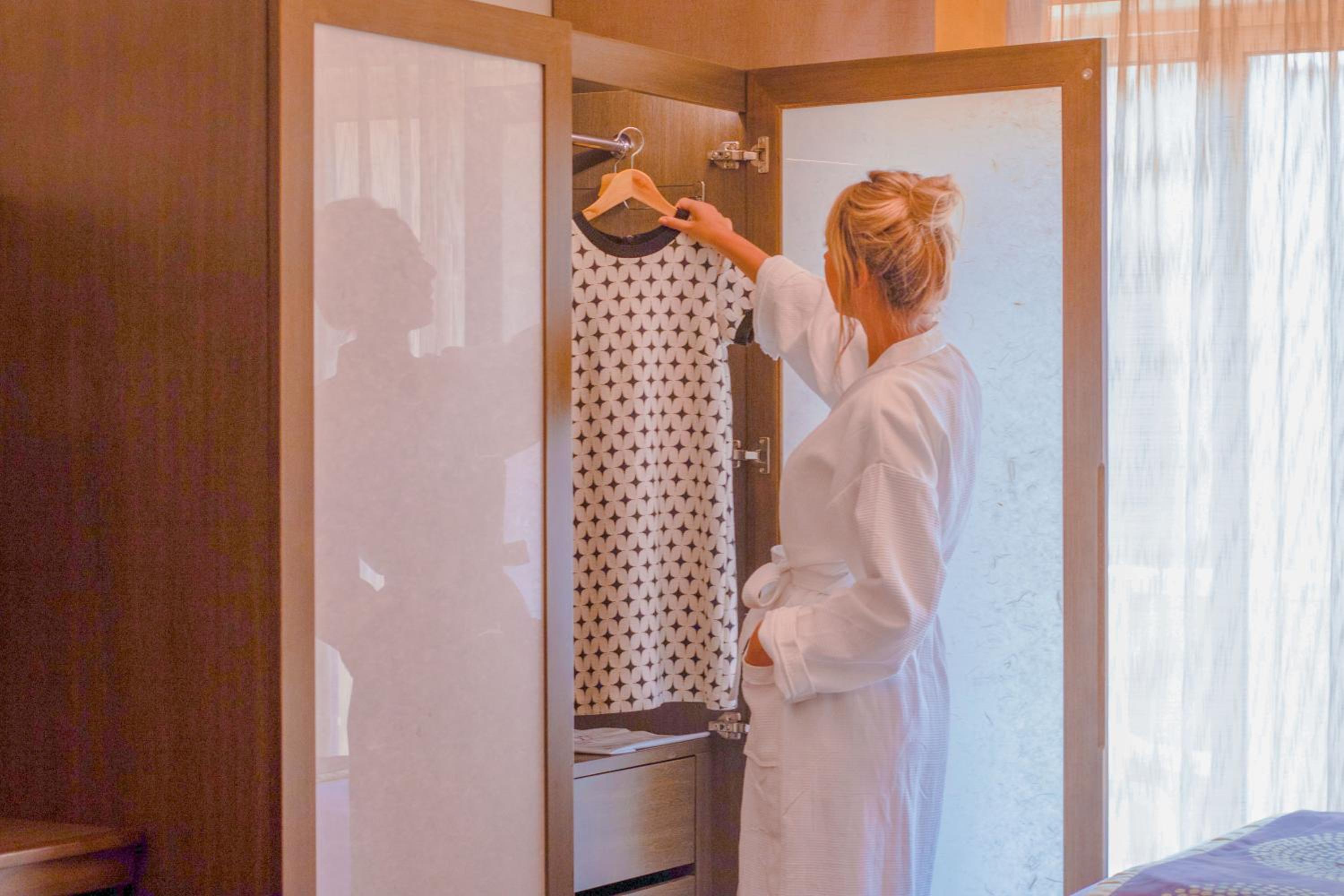 Pokoj byl zařízen velmi promyšleně, se spoustou praktických detailů, ocenila jsem snadnou možnost vyprání a vyžehlení oblečení, dostatek balené vody, pohodlné postele, možnost tlumeného osvětlení, průsvitné záclony, dostatek vodorovných ploch na odložení věcí.