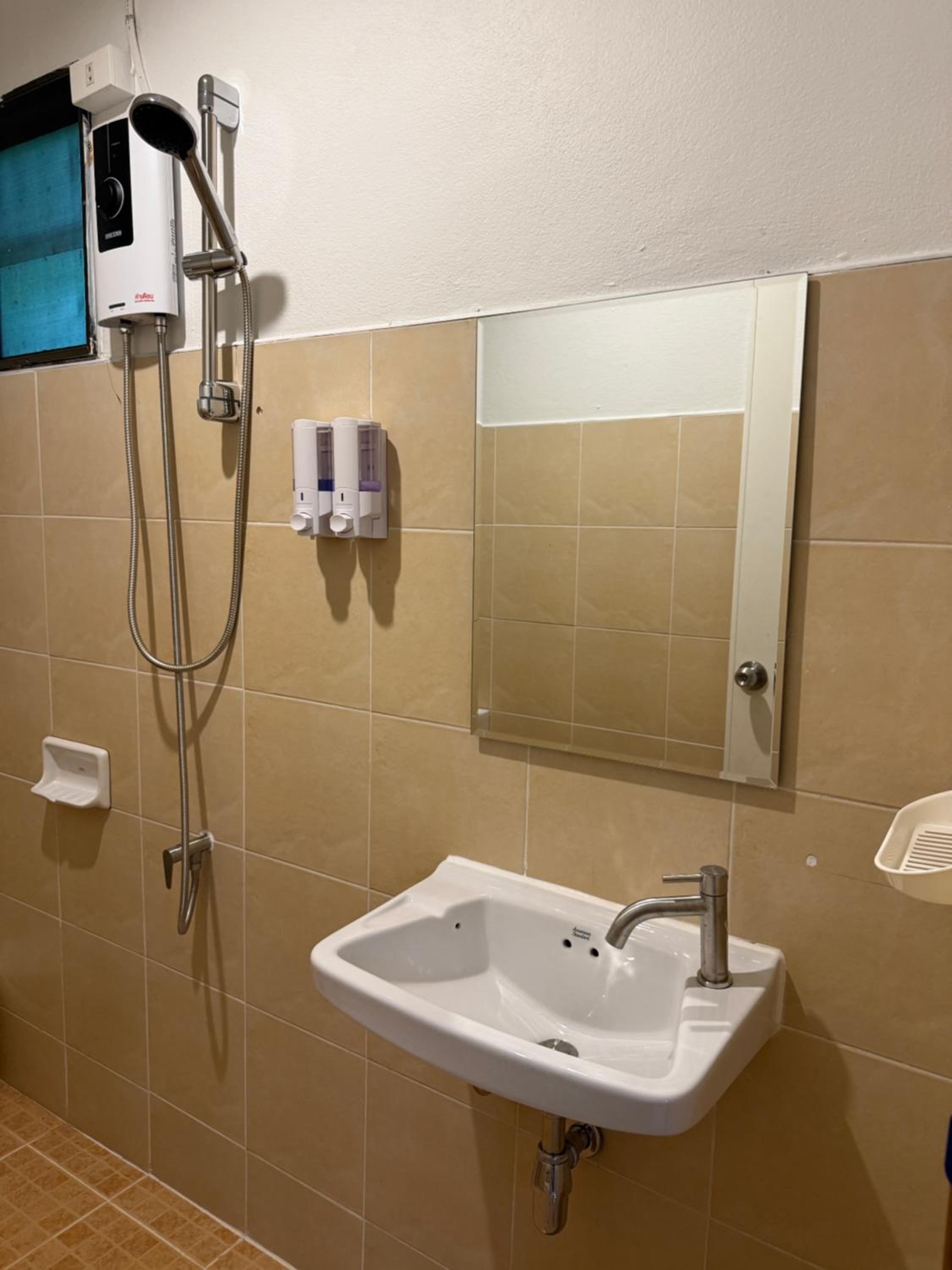 Das Badezimmer ist zwar ungewöhnlich, funktioniert aber super, einzig ein Abzieher für den Boden würde zu einer schnelleren Trocknung führen.