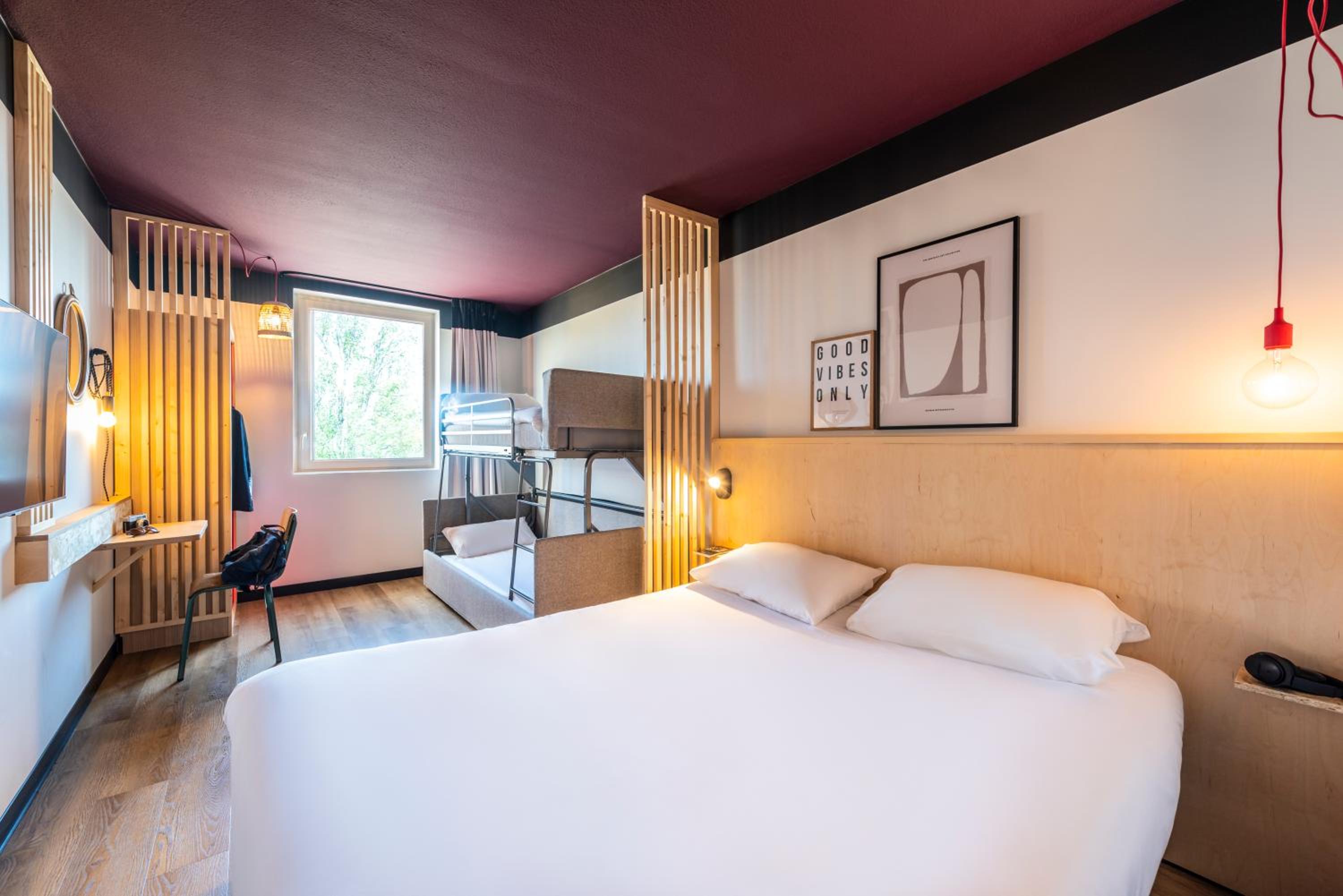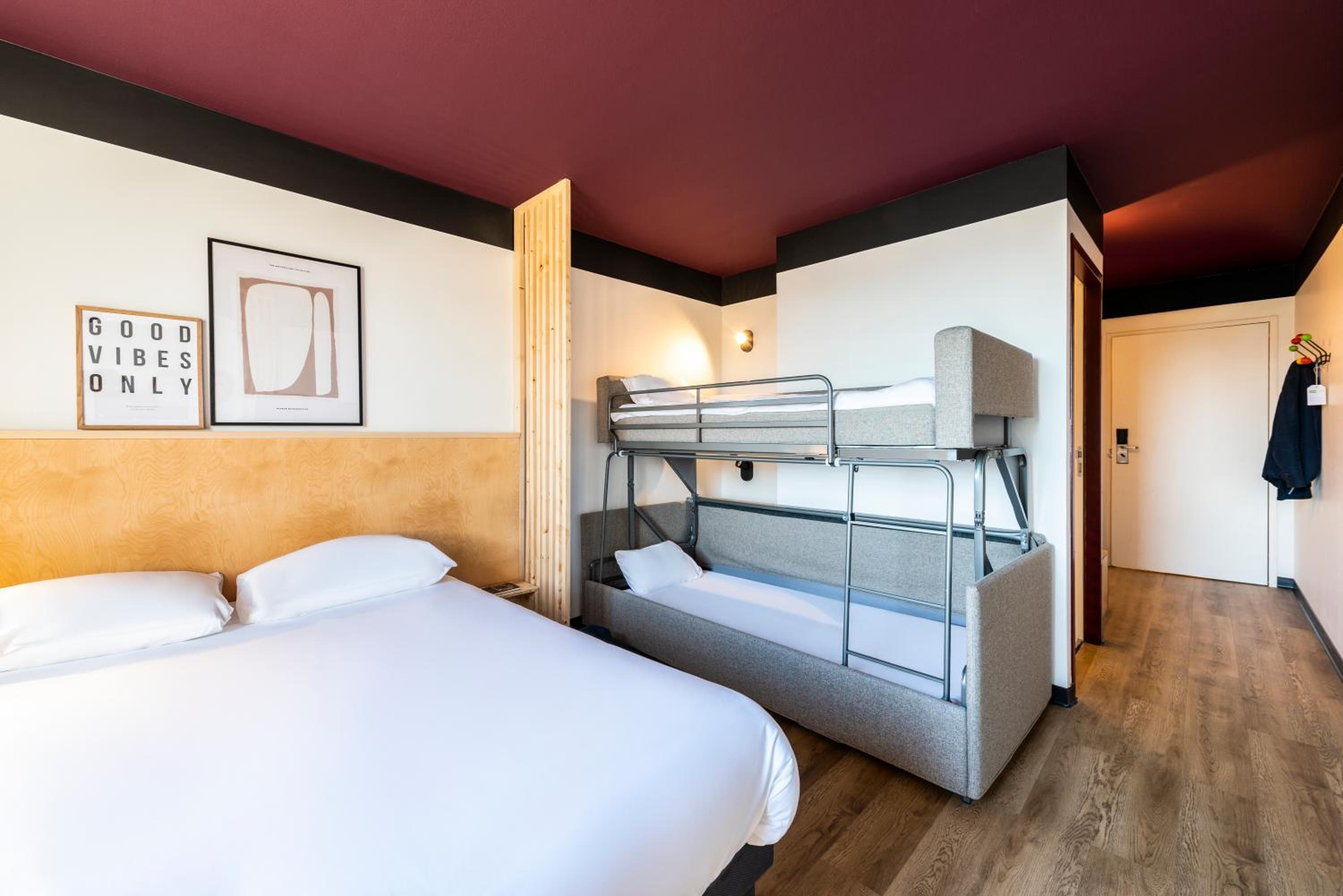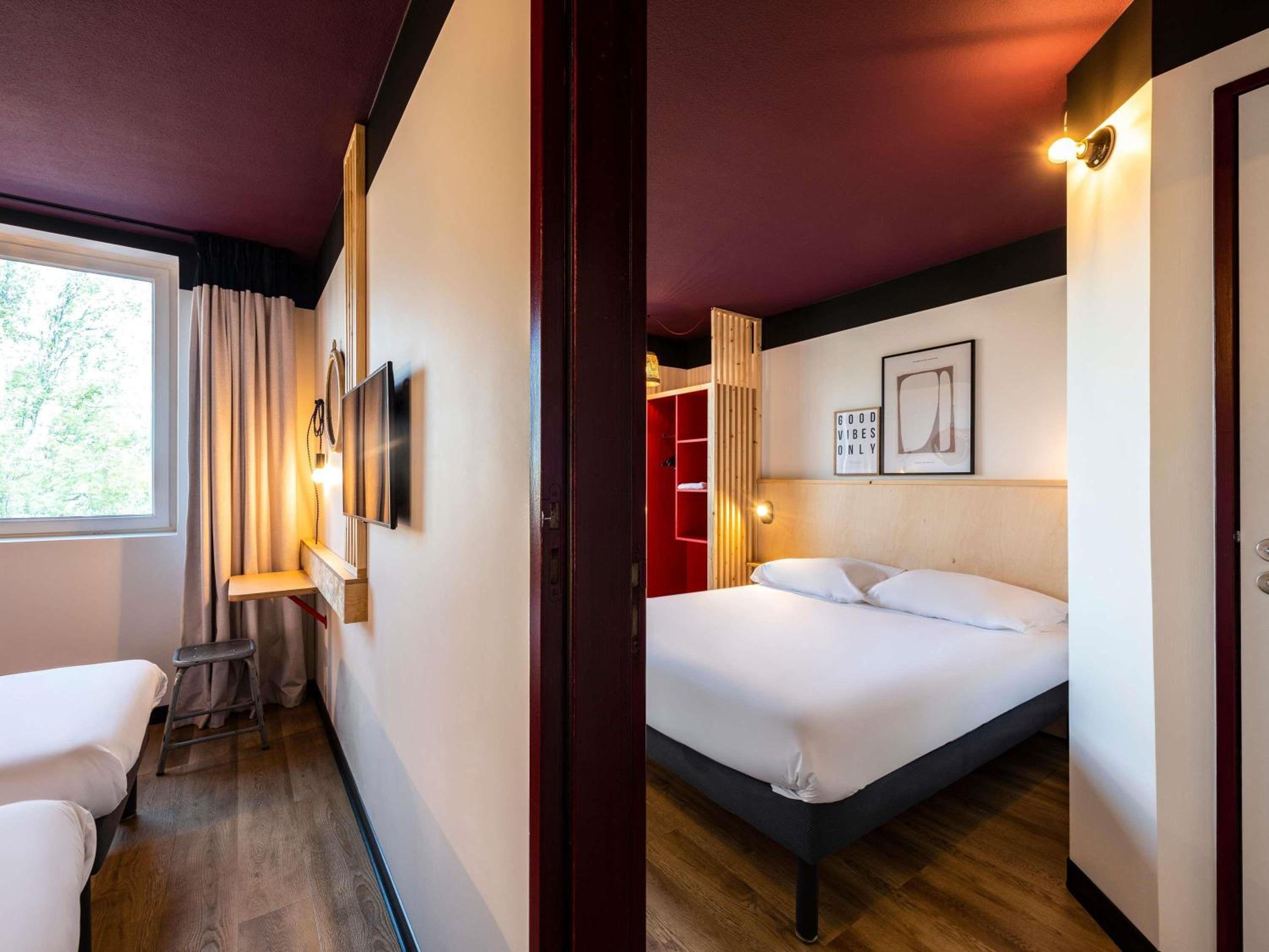 Our hotel boasts 82 elegantly renovated rooms, featuring family-friendly Tribus rooms that can accommodate up to 5 guests. Enjoy restful nights on our "sweet bed" bedding and stay entertained with flat-screen TVs and high-speed wifi.