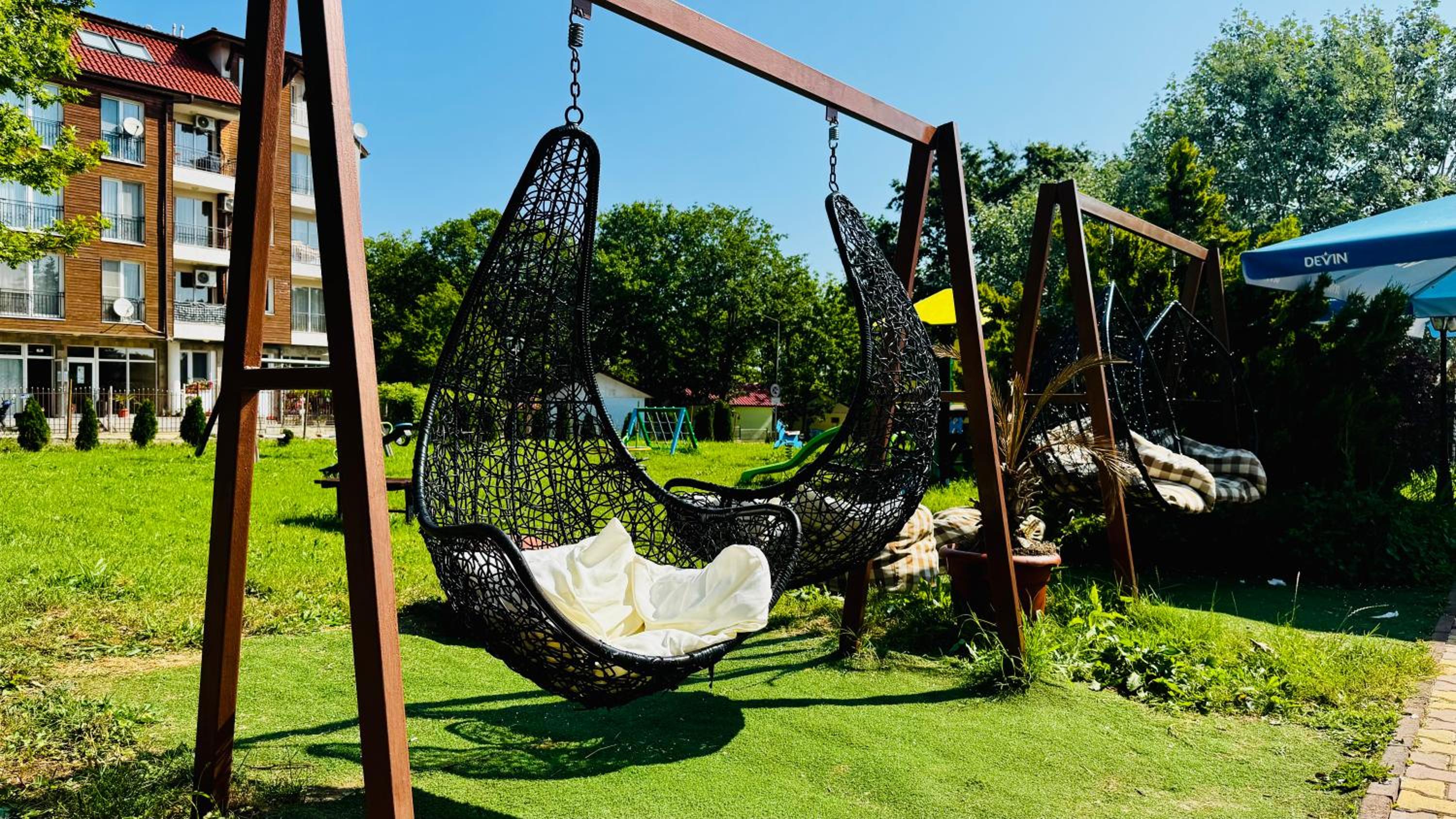 В банята може да има една завеса, няма достатъчно кошчета и в двора на хотела и в стаята може да има на терасата, оси на масите постоянно те обикалят