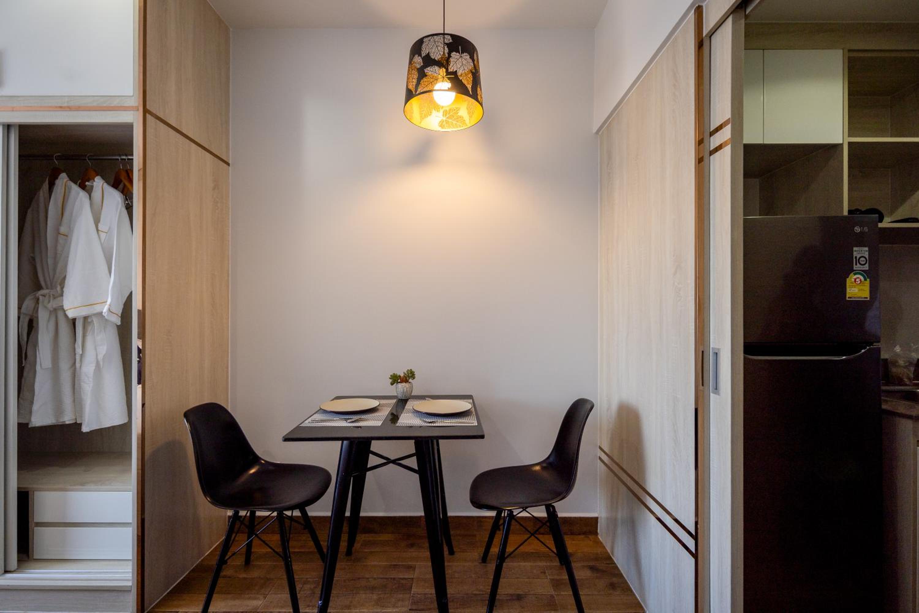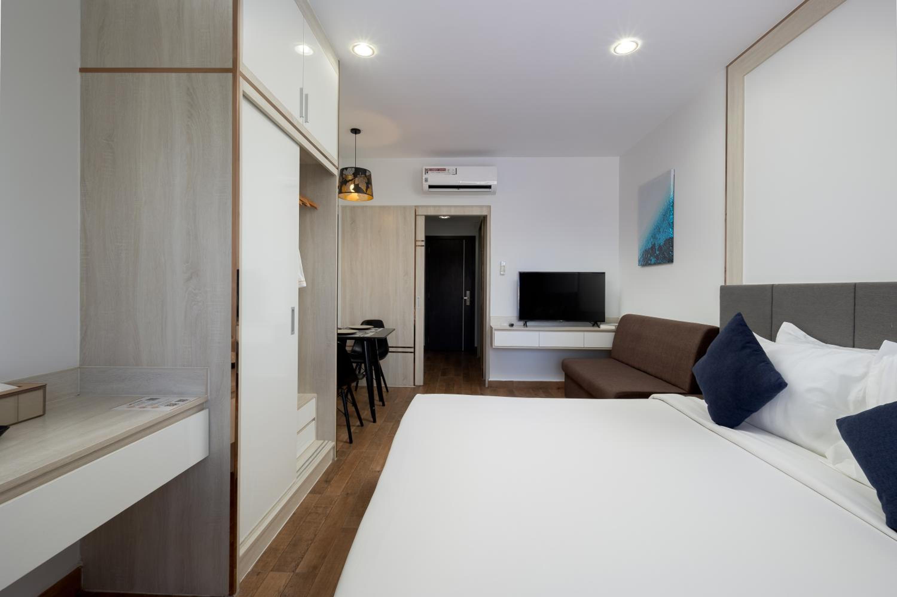 Agréable appartement neuf, propre et confortable à notre demande on nous a apporté des ustensiles de cuisine. Il y a un lave linge dans l'appartement. La piscine, la salle de sport et le service de restauration qui livre des plats dans l'appartement sont des plus appréciable. Le personnel est à l'écoute et avenant.