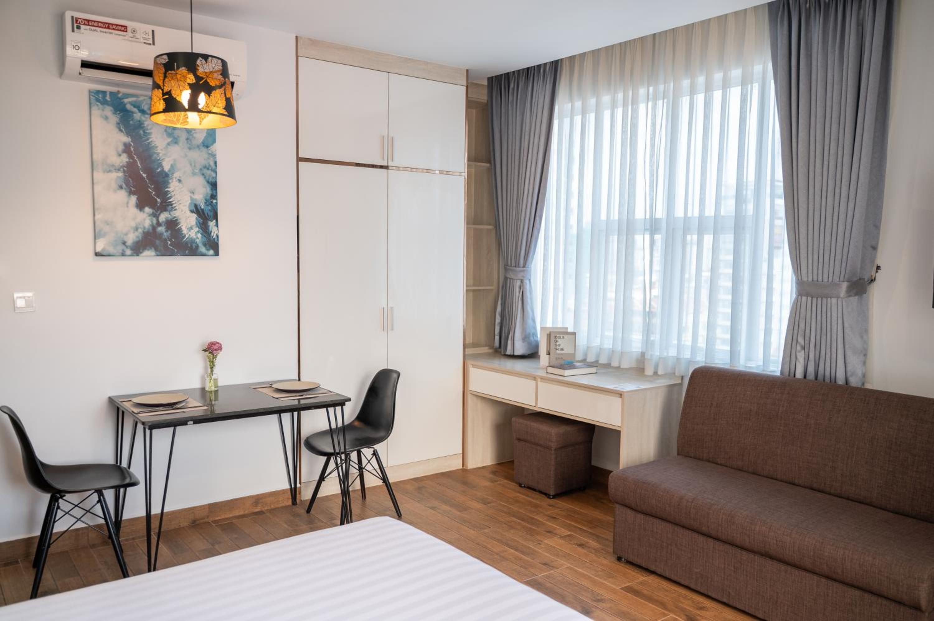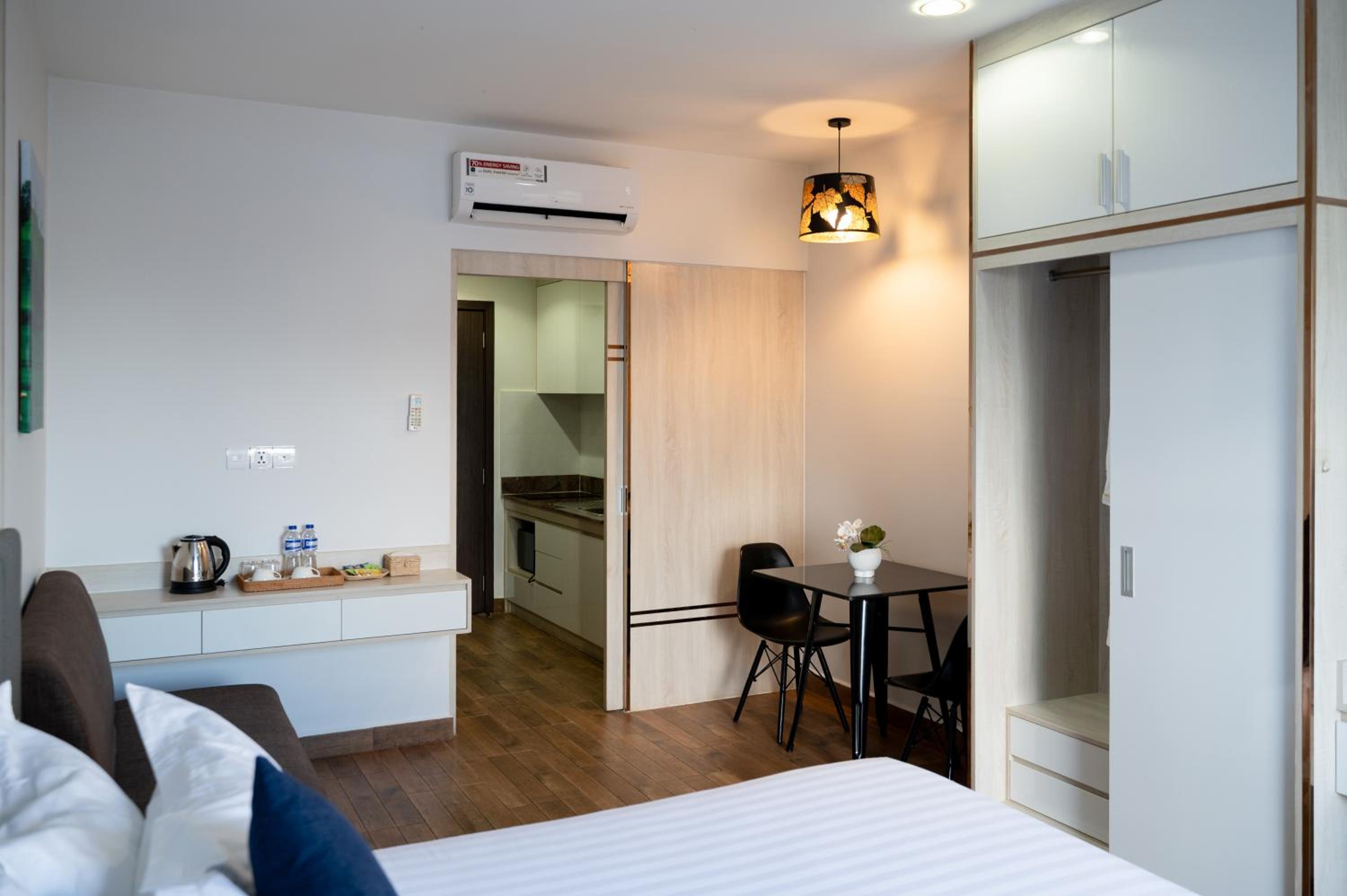 Nous avions la cuisinette mais aucun ustensile ou vaisselle. Le petit déjeuner était inclus mais nous n’avons pas aimé. L’hôtel est un peu loin du centre mais la ligne 1 d’autobus nous y emmène rapidement.