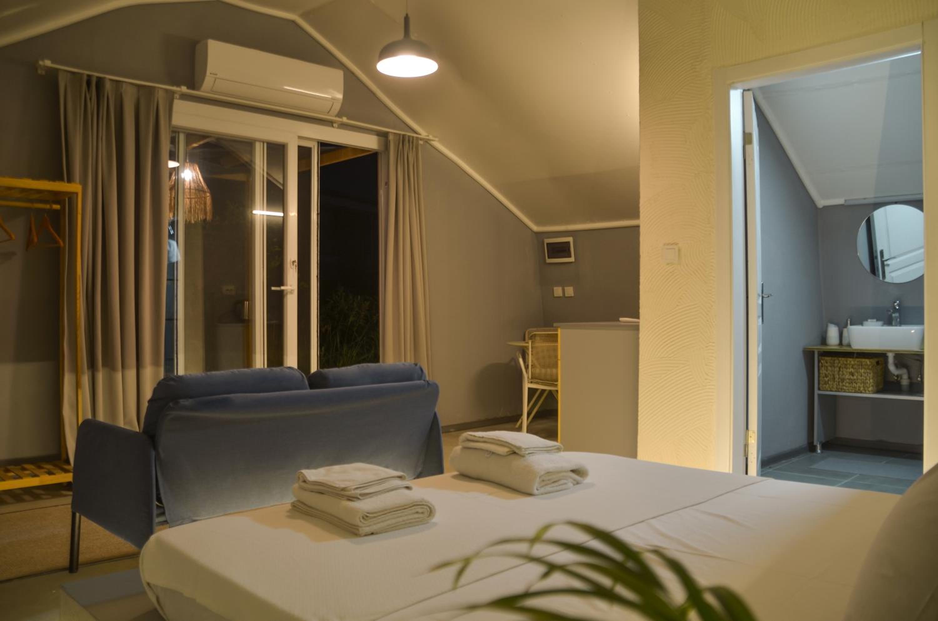 Each room features a private balcony with stunning garden views, air conditioning, and modern amenities including an electric kettle and private bathroom. Select rooms even offer a kitchenette for added convenience.