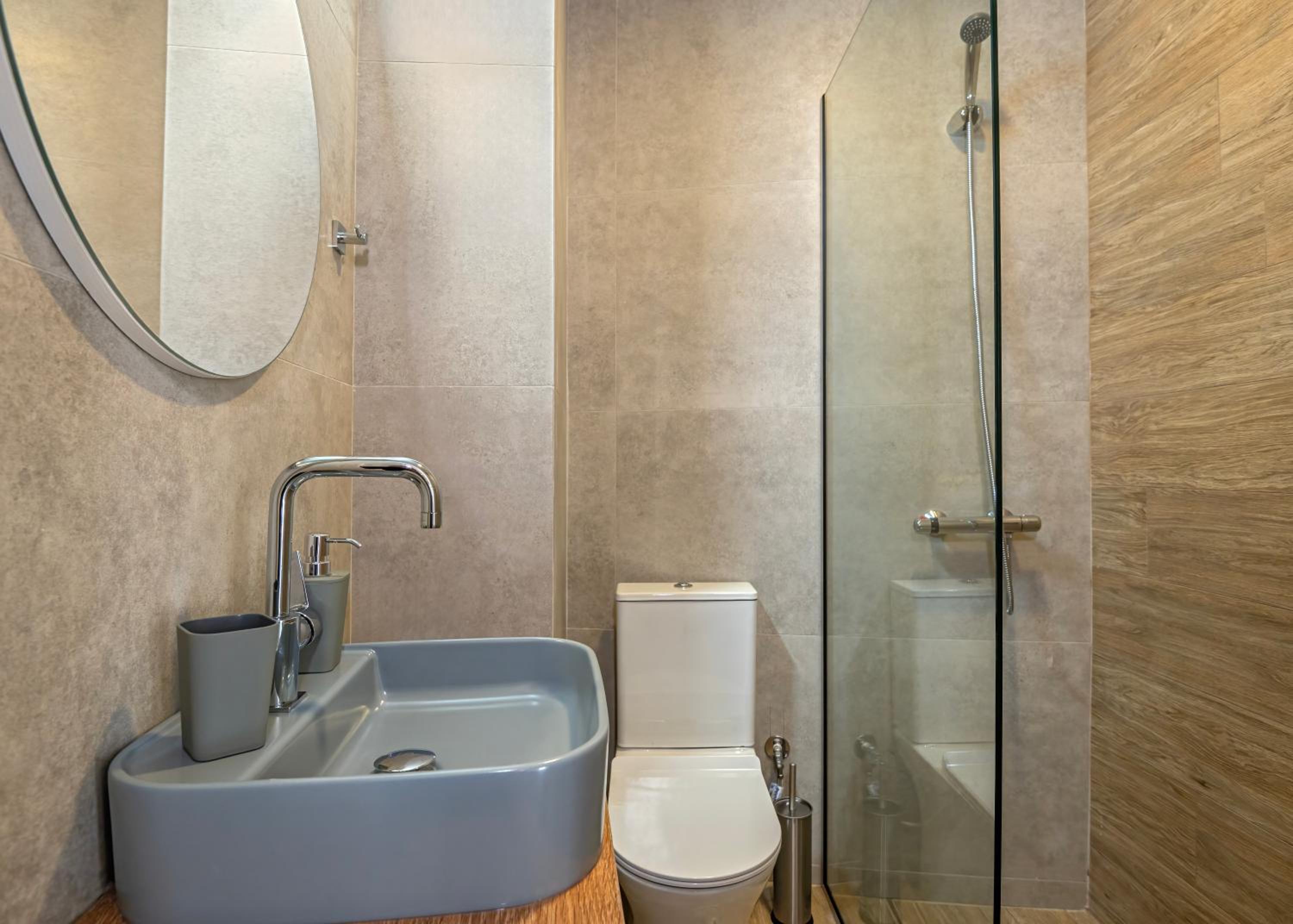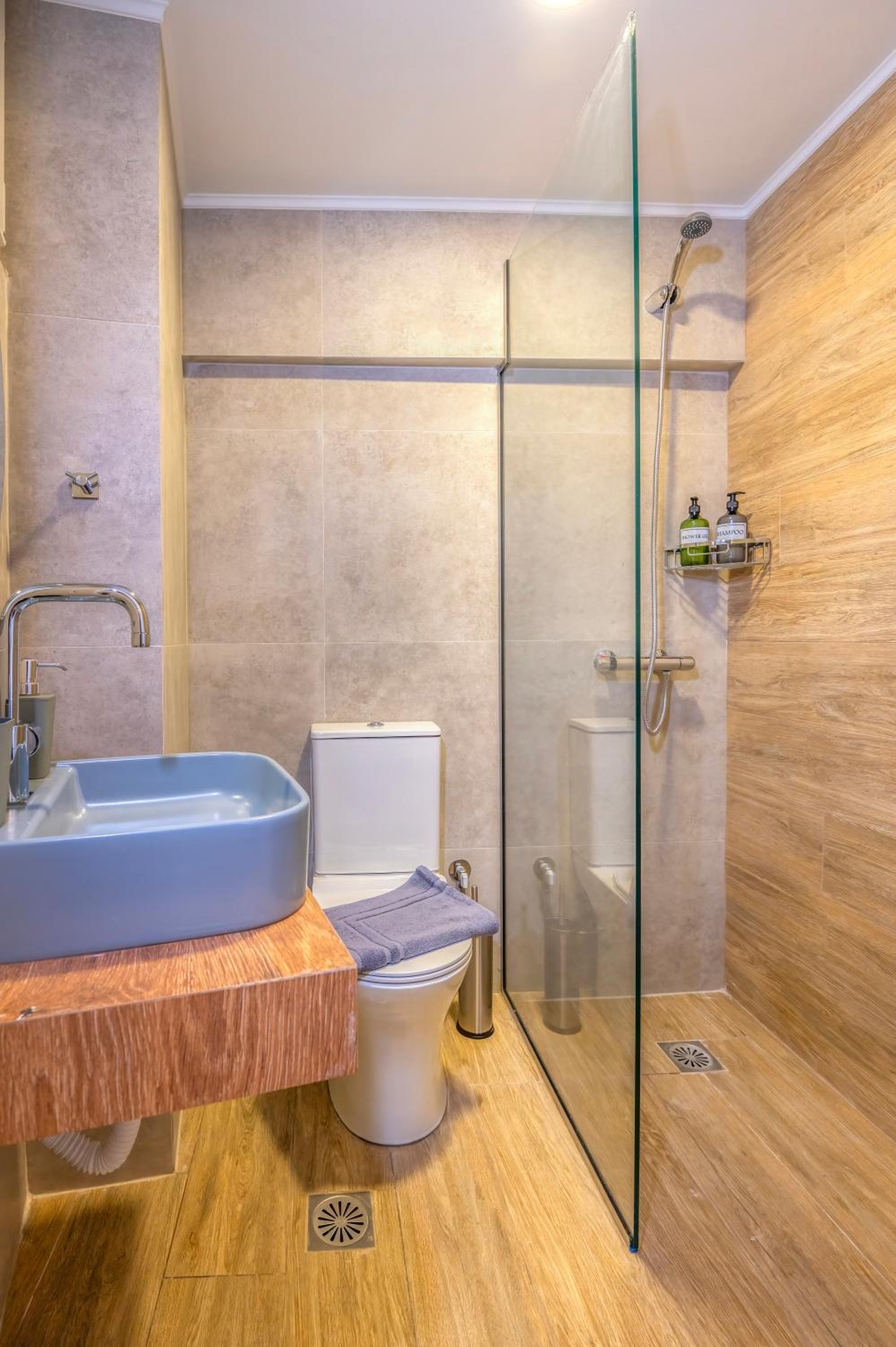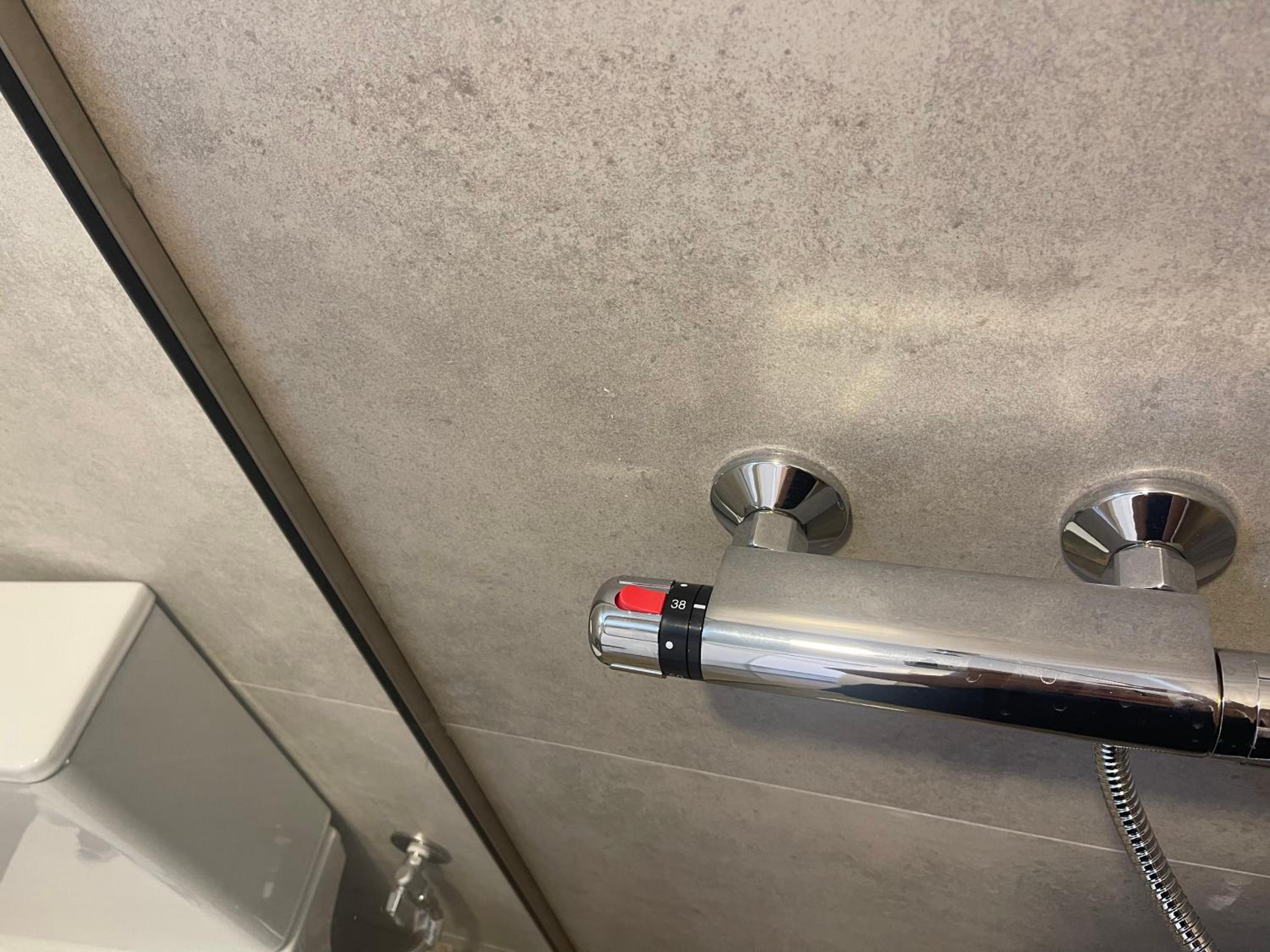 Bagno piccolo per soggiorni prolungati, con la doccia senza parete che bagna il resto del bagno. Nell’annuncio è segnata la lavastoviglie ma nel nostro appartamento non c’era. Cose di poco conto comunque, ne vale la pena!